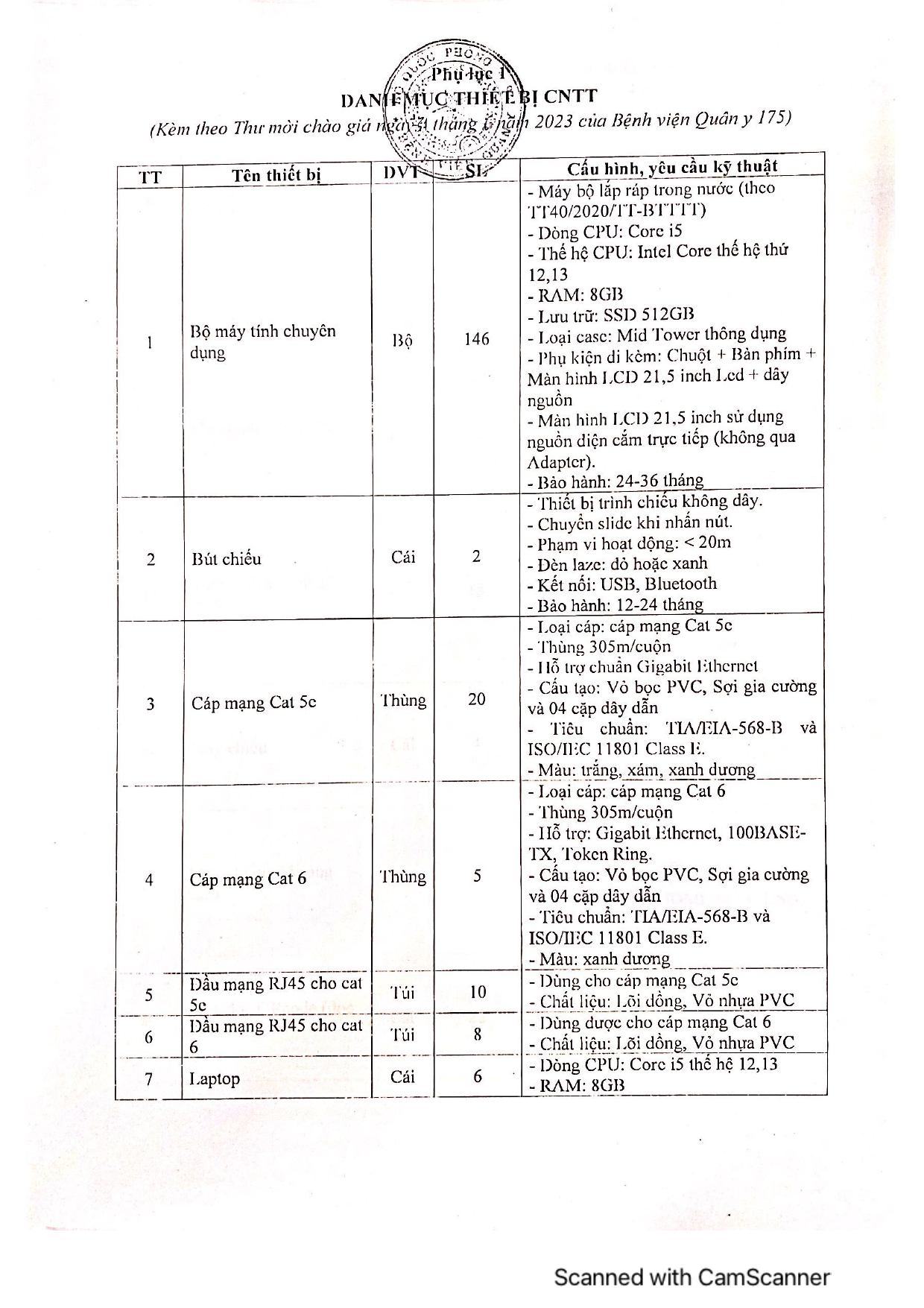 Bệnh viện Quân y 175 đang có nhu cầu mua sắm các thiết bị chuyên dụng CNTT; Bệnh viện kính mời các đơn vị quan tâm, có khả năng, cung cấp các tài liệu liên quan đến các danh mục mời chào giá và gửi báo giá cung cấp hàng hóa như sau: