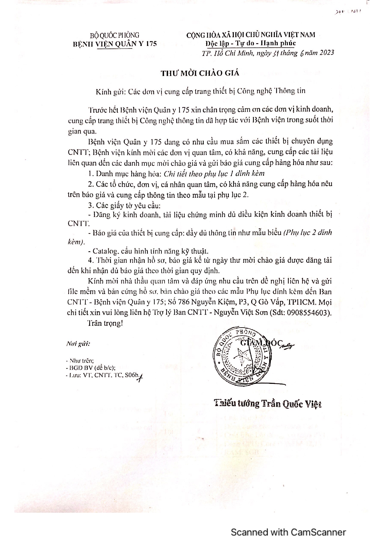 Kính mời nhà thầu quan tâm và đáp ứng nhu cầu trên đề nghị liên hệ và gửi file mềm và bản cứng hồ sơ, bản chào giá theo các mẫu Phụ lục đính kèm đến Ban CNTT – Bệnh viện Quân y 175; Số 786 Nguyễn Kiệm, P3, Q Gò Vấp, TPHCM.