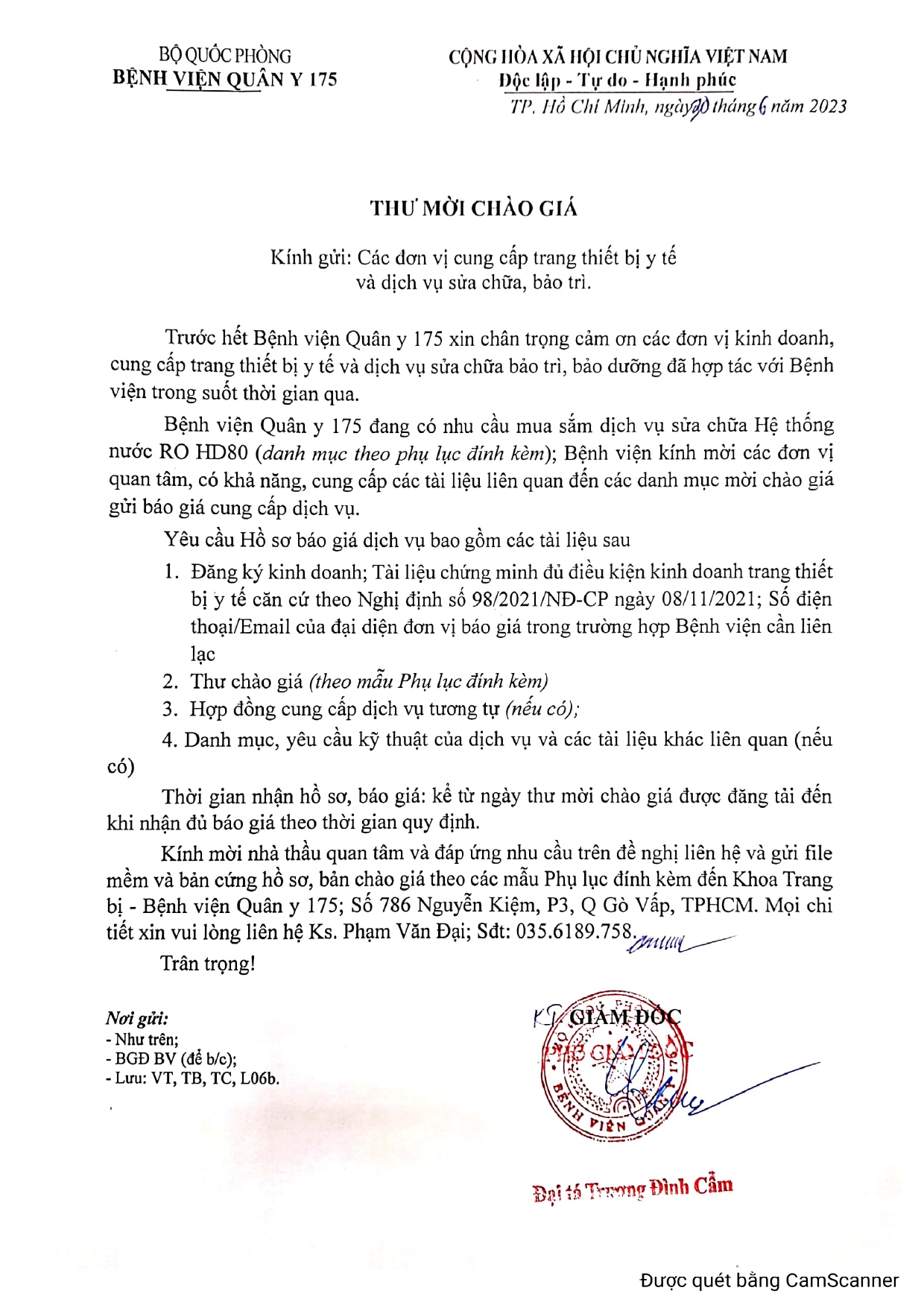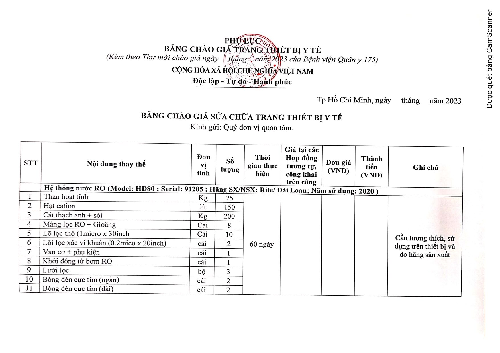 Bệnh viện Quân y 175 đang có nhu cầu mua sắm dịch vụ sửa chữa Hệ thống nước RO HD80 (danh mục theo phụ lục đính kèm); Bệnh viện kính mời các đơn vị quan tâm, có khả năng, cung cấp các tài liệu liên quan đến các danh mục mời chào giá gửi báo giá cung cấp dịch vụ.