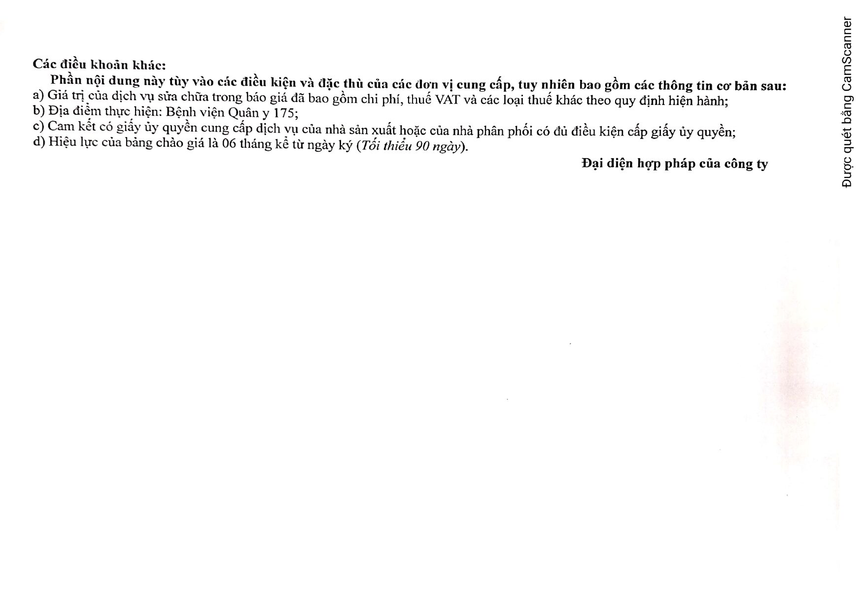 Kính mời nhà thầu quan tâm và đáp ứng nhu cầu trên đề nghị liên hệ và gửi file mềm và bản cứng hồ sơ, bản chào giá theo các mẫu Phụ lục đính kèm đến Khoa Trang bị – Bệnh viện Quân y 175; Số 786 Nguyễn Kiệm, P3, Q Gò Vấp, TPHCM.