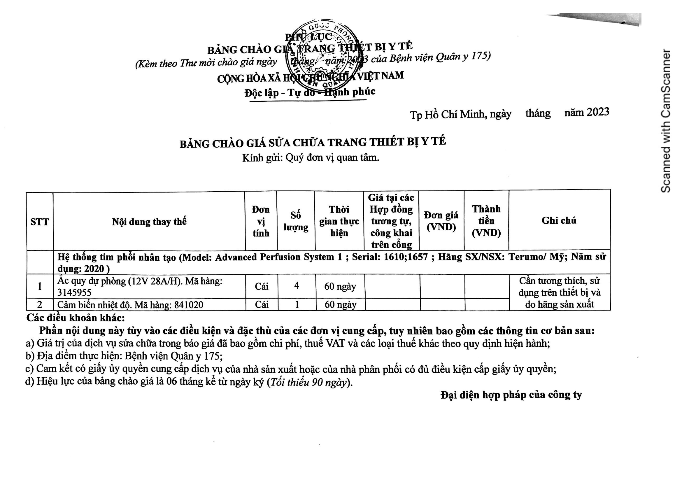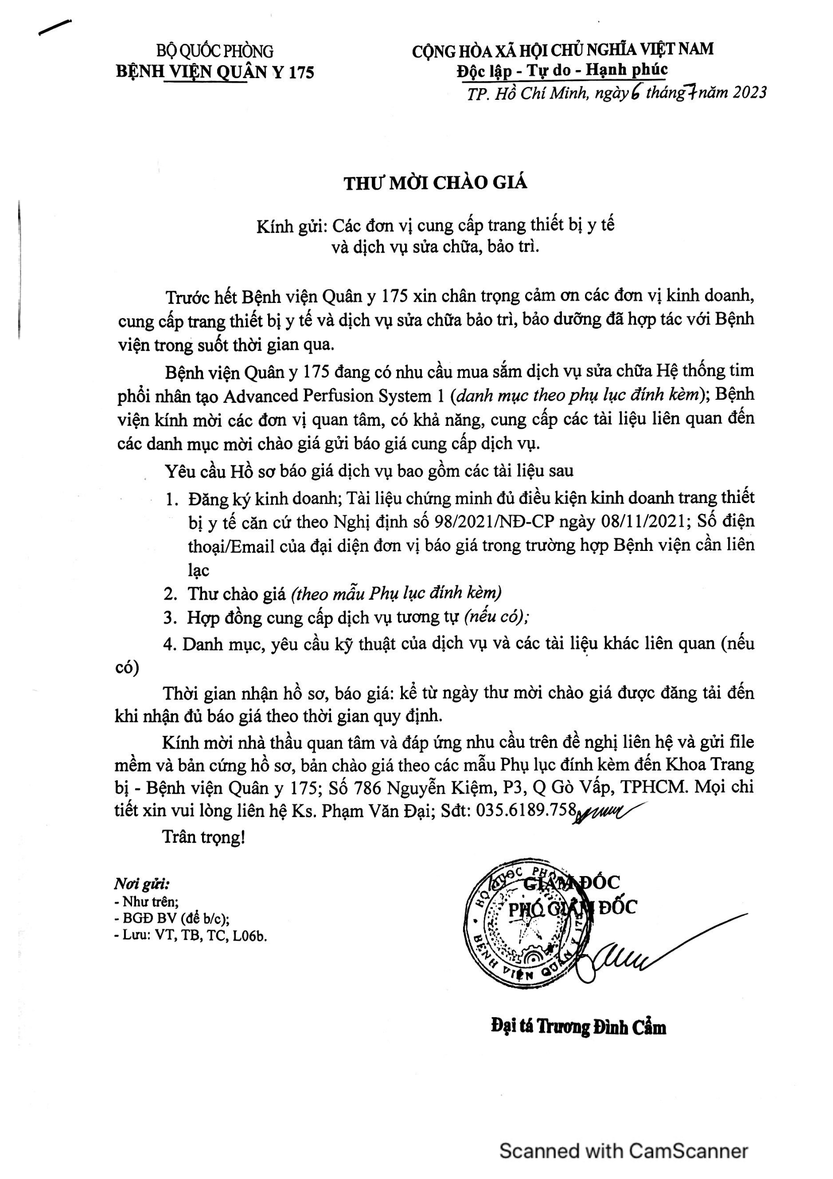 Kính mời nhà thầu quan tâm và đáp ứng nhu cầu trên đề nghị liên hệ và gửi file mềm và bản cứng hồ sơ, bản chào giá theo các mẫu Phụ lục đính kèm đến Khoa Trang bị – Bệnh viện Quân y 175; Số 786 Nguyễn Kiệm, P3, Q Gò Vấp, TPHCM.