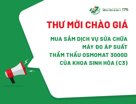 Bệnh viện Quân y 175 đang có nhu cầu mua sắm dịch vụ sửa chữa máy đo áp suất thẩm thẩu Osmomat 3000D của khoa C3 (danh mục theo phụ lục đính kèm); Bệnh viện kính mời các đơn vị quan tâm, có khả năng, cung cấp các tài liệu liên quan đến các danh mục mời chào giá gửi báo giá cung cấp dịch vụ.