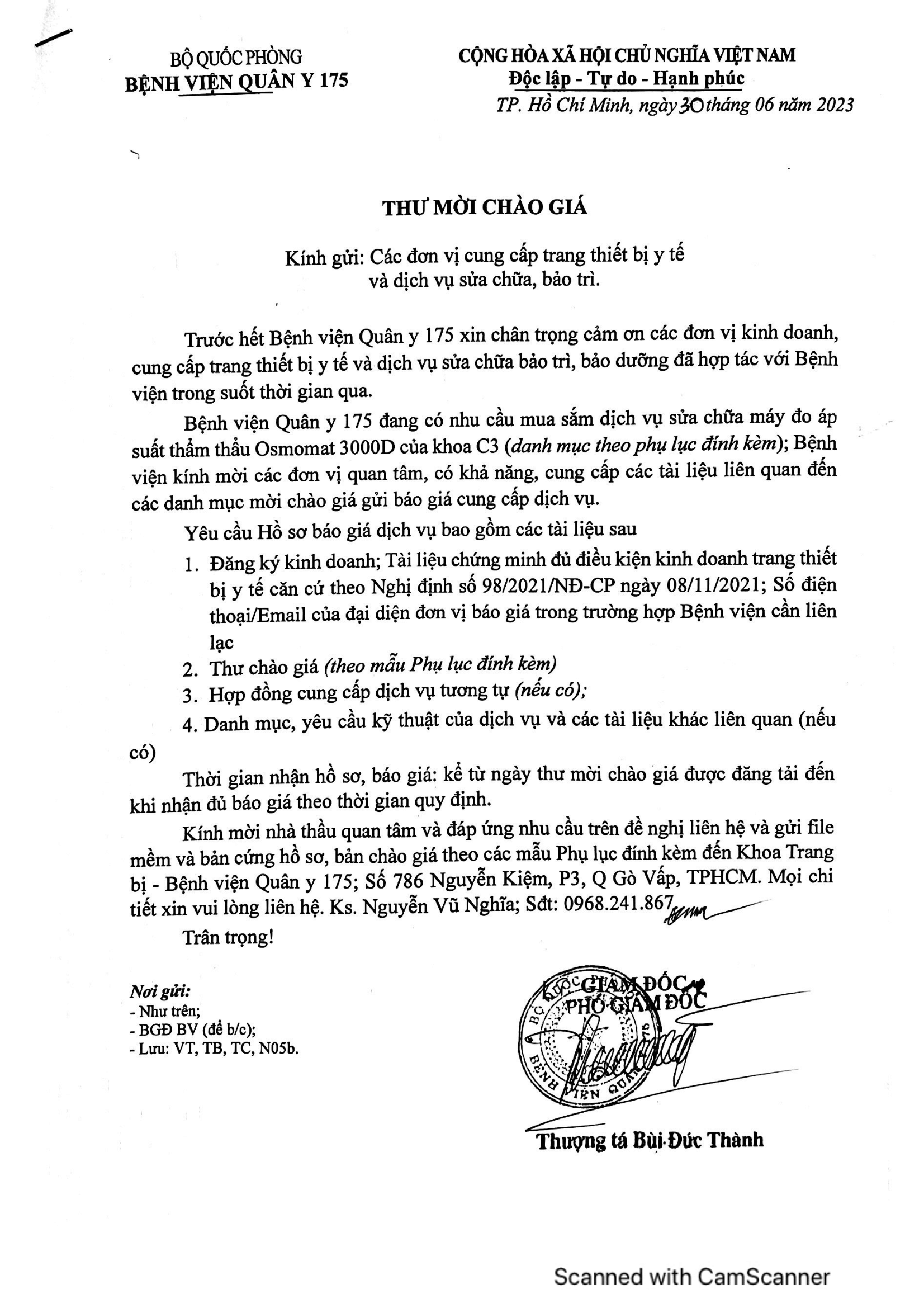 Kính mời nhà thầu quan tâm và đáp ứng nhu cầu trên đề nghị liên hệ và gửi file mềm và bản cứng hồ sơ, bản chào giá theo các mẫu Phụ lục đính kèm đến Khoa Trang bị – Bệnh viện Quân y 175; Số 786 Nguyễn Kiệm, P3, Q Gò Vấp, TPHCM.