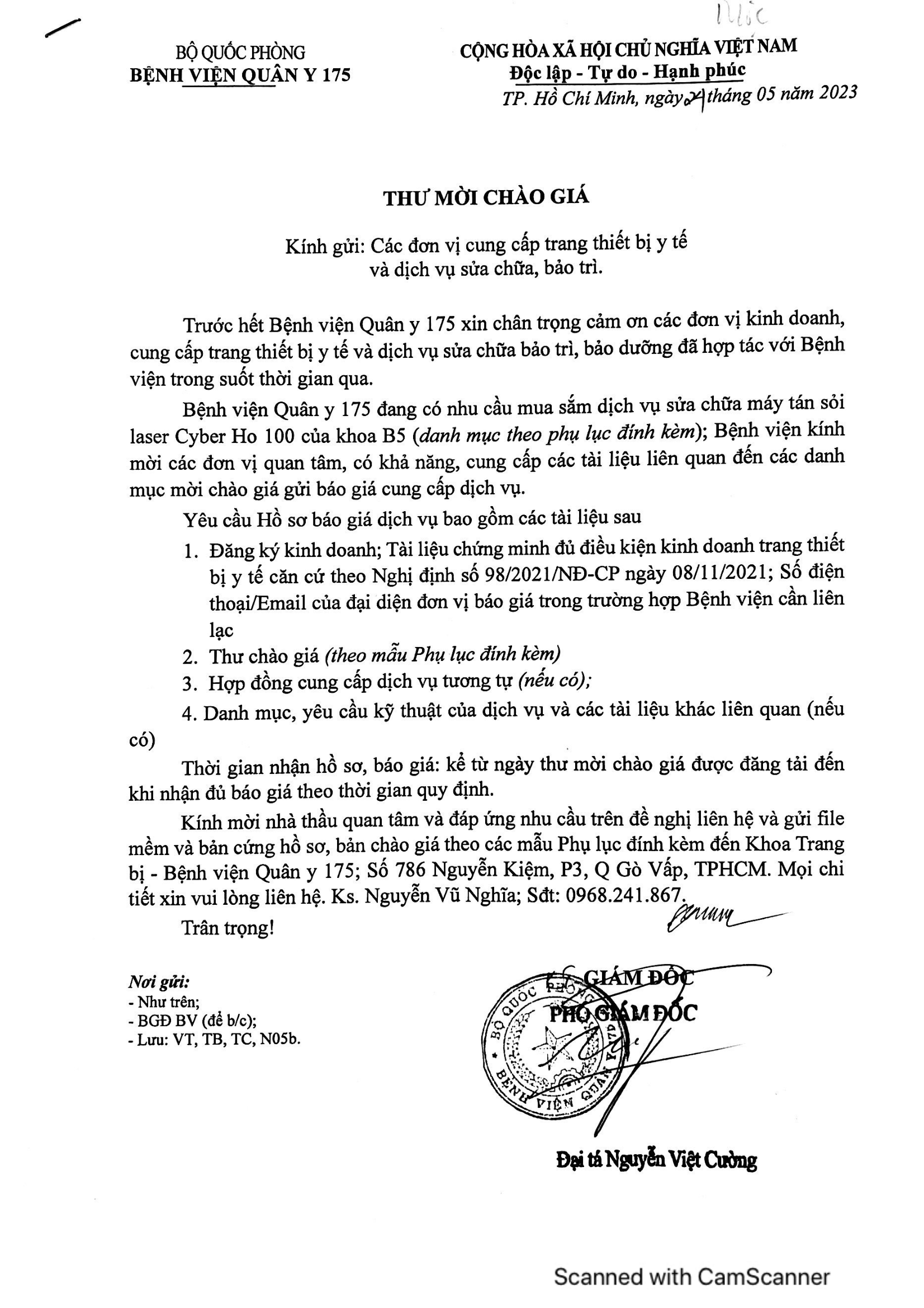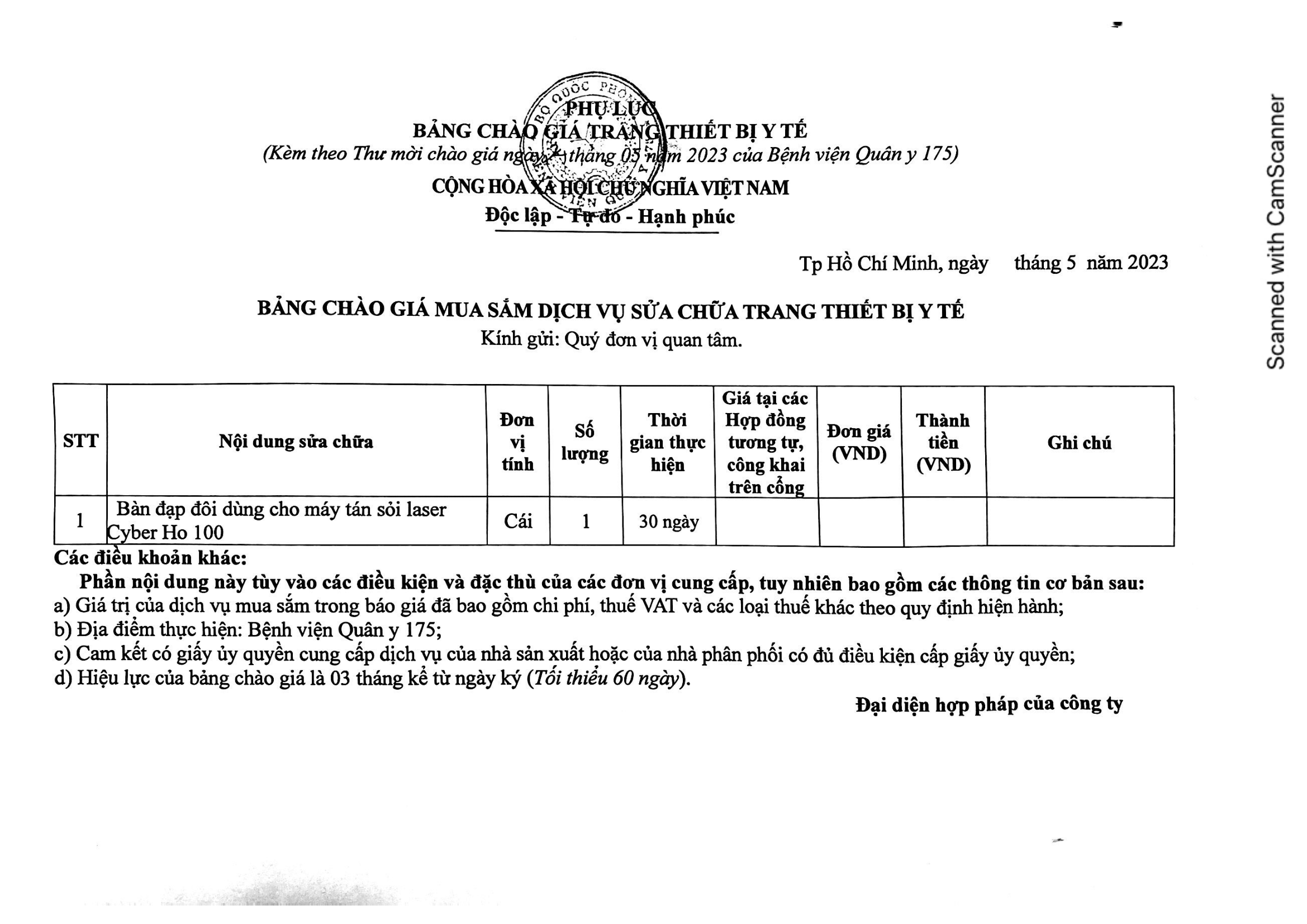 Bệnh viện Quân y 175 đang có nhu cầu mua sắm dịch vụ sửa chữa máy tán sỏi laser Cyber Ho 100 của khoa B5 (danh mục theo phụ lục đính kèm); Bệnh viện kính mời các đơn vị quan tâm, có khả năng, cung cấp các tài liệu liên quan đến các danh mục mời chào giá gửi báo giá cung cấp dịch vụ.