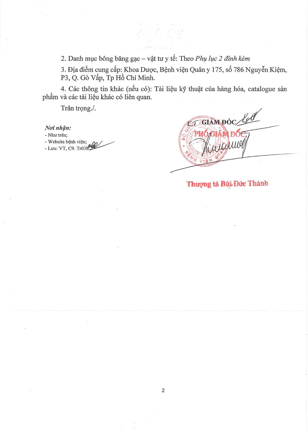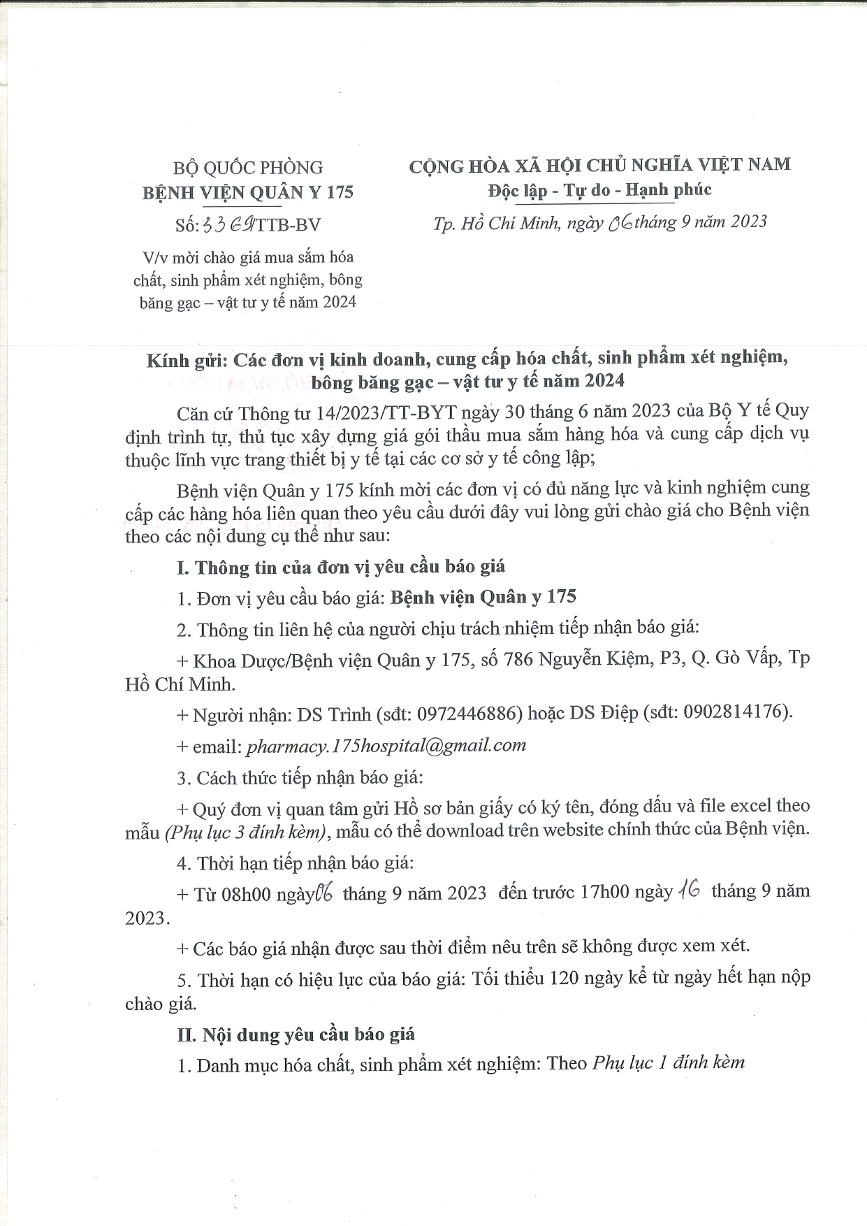 - Đơn vị yêu cầu báo giá: Bệnh viện Quân y 175