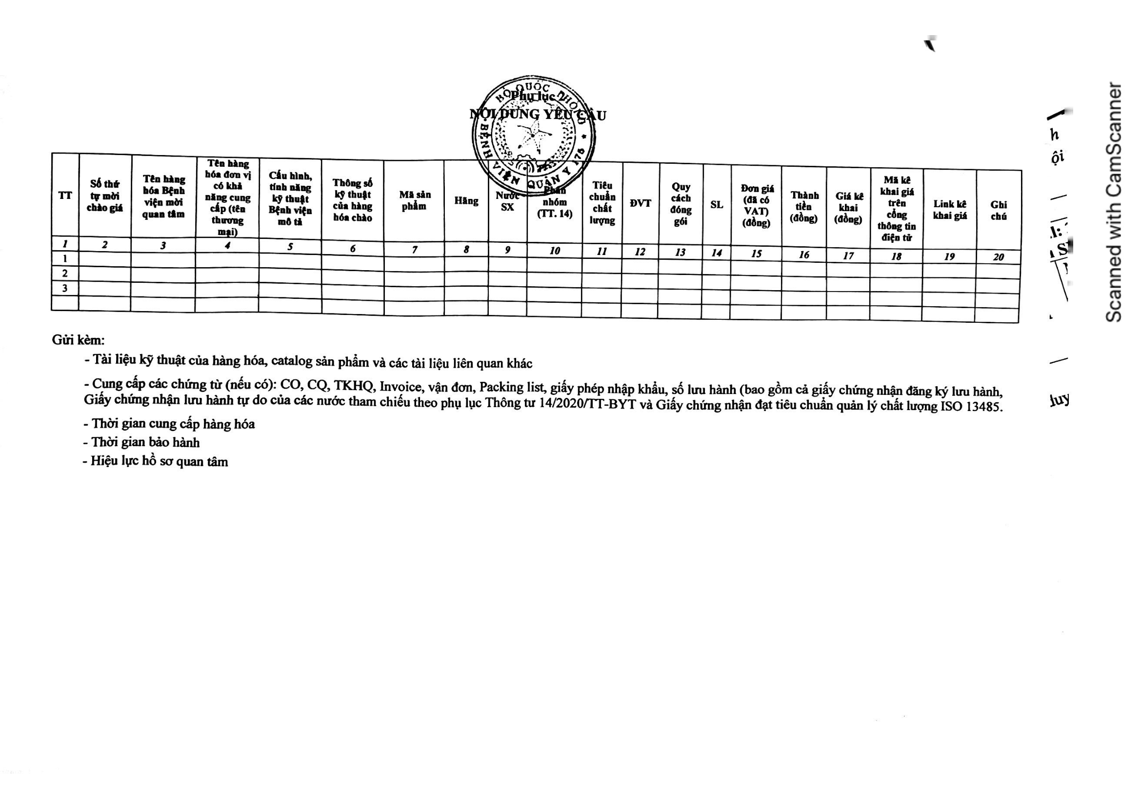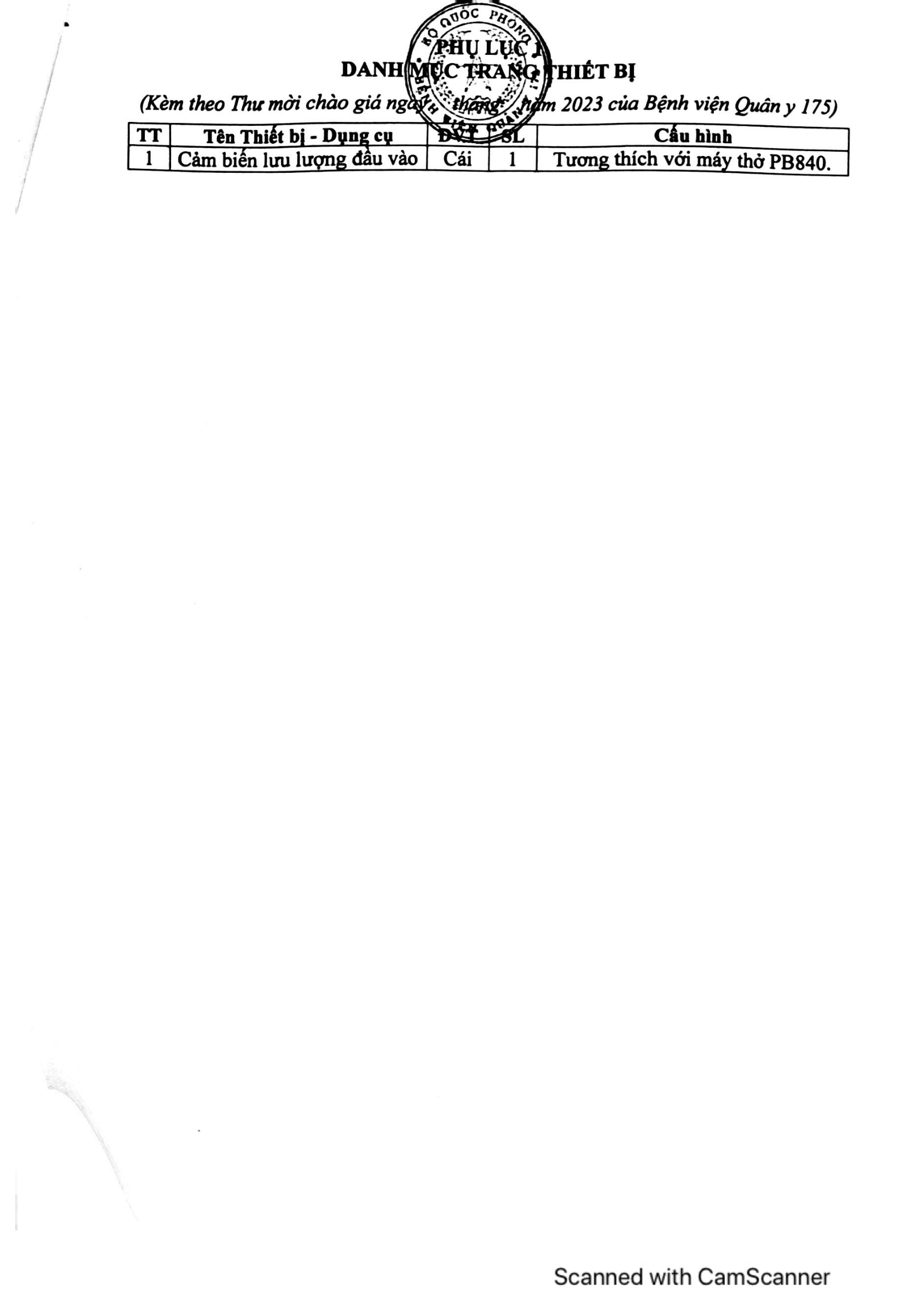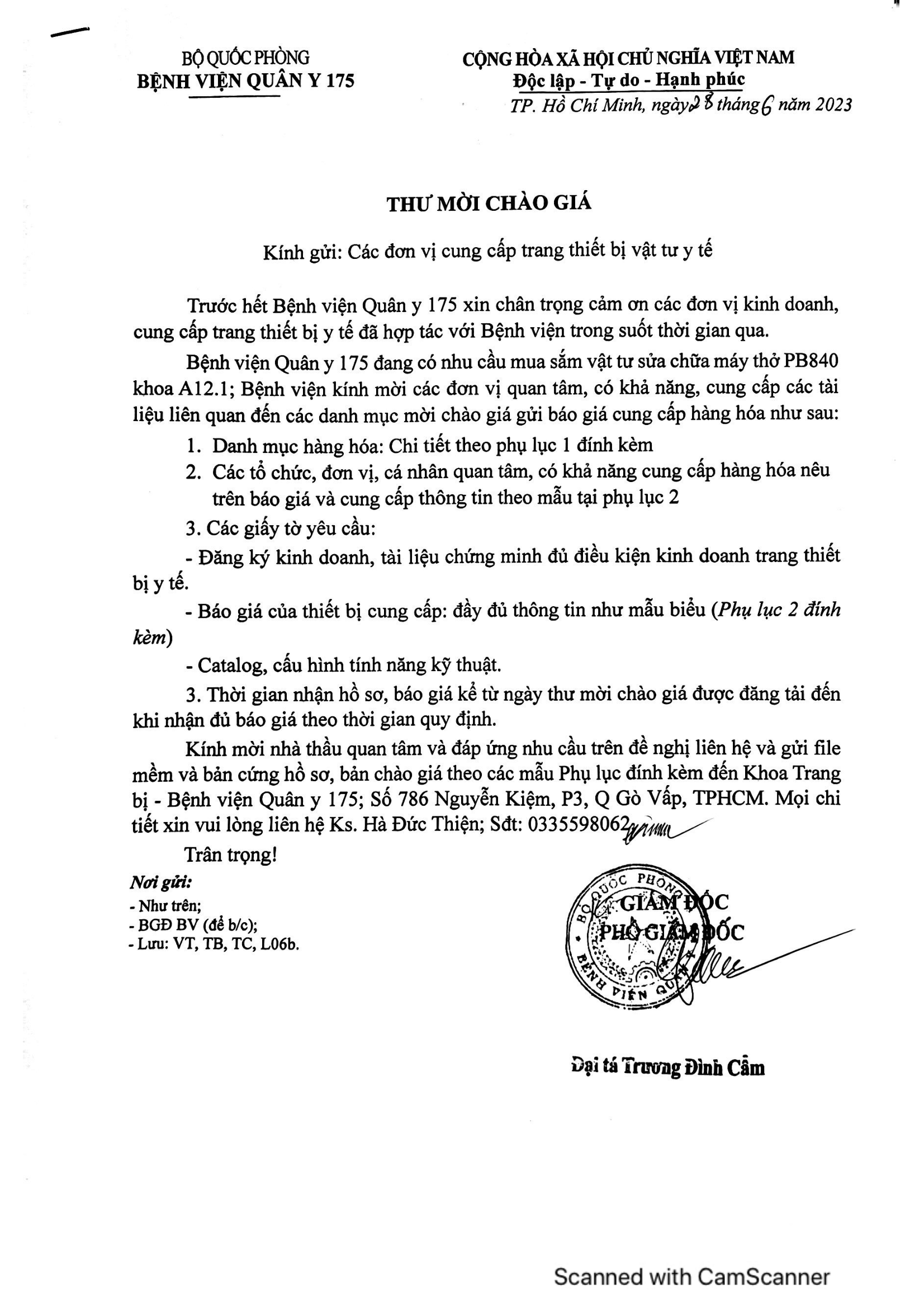 Kính mời nhà thầu quan tâm và đáp ứng nhu cầu trên đề nghị liên hệ và gửi file mềm và bản cứng hồ sơ, bản chào giá theo các mẫu Phụ lục đính kèm đến Khoa Trang bị – Bệnh viện Quân y 175; Số 786 Nguyễn Kiệm, P3, Q Gò Vấp, TPHCM.