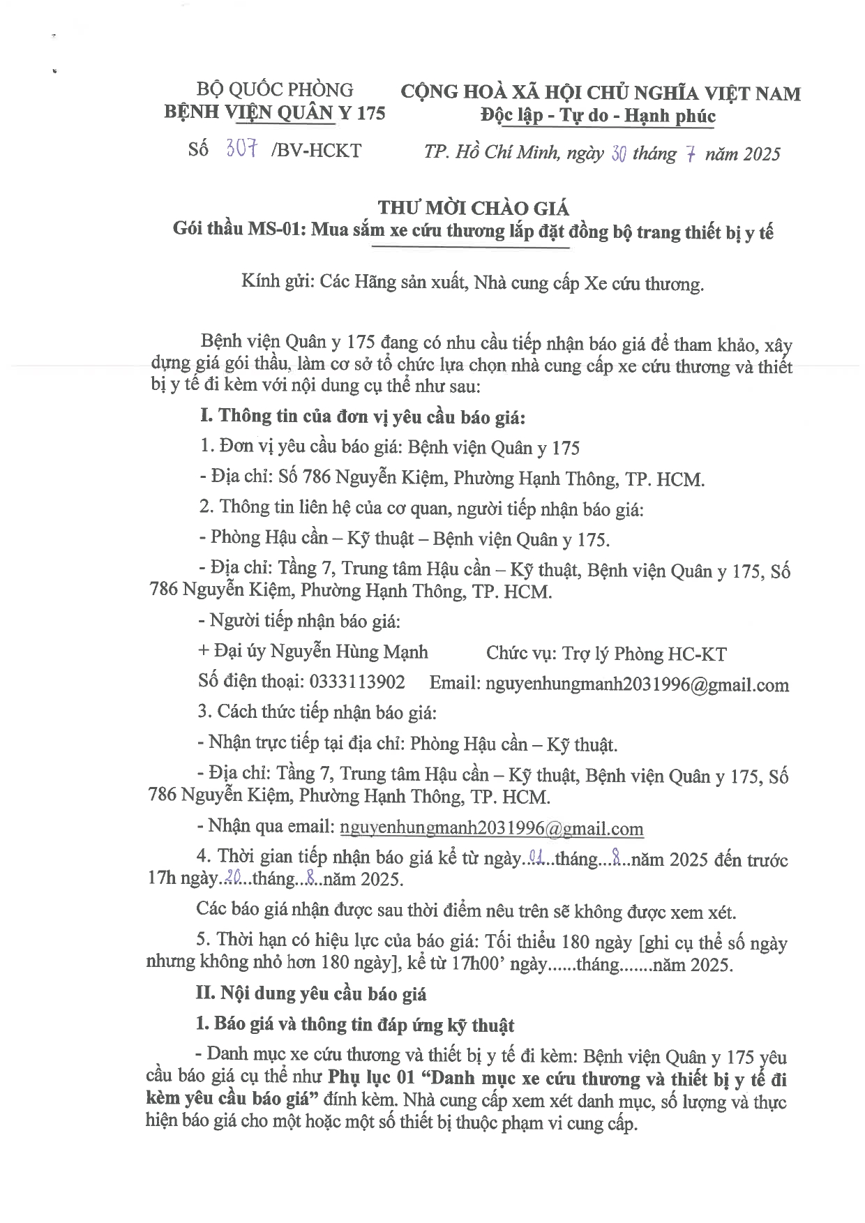 Bệnh viện Quân y 175 đang có nhu cầu tiếp nhận báo giá để tham khảo, xây dựng giá gói thầu, làm cơ sở tổ chức lựa chọn nhà cung cấp xe cứu thương và thiết bị y tế đi kèm với nội dung cụ thể như sau.