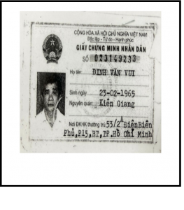 Qua tìm hiểu được biết, khi bệnh nhân cấp cứu vào Bệnh viện, bệnh nhân có một bản chứng minh nhân poto mang tên Đinh Văn Vui, sinh năm 1965. Quê quán Tiền Giang, HKTT tại 53/2A, P15, Bình Thạnh, TP Hồ CHí Minh. Trước đó bệnh nhân đã sử dụng CMND photo để thuê phòng tại khách sạn Màu Tím, 847 Hà Huy Giáp, Phường Thạnh Lộc, Quận 12. Bệnh viện đã tìm hiểu và được biết ông Đinh Văn Vui trong chứng minh nhân dân trên vẫn còn sống khỏe mạnh tại Bình dương.