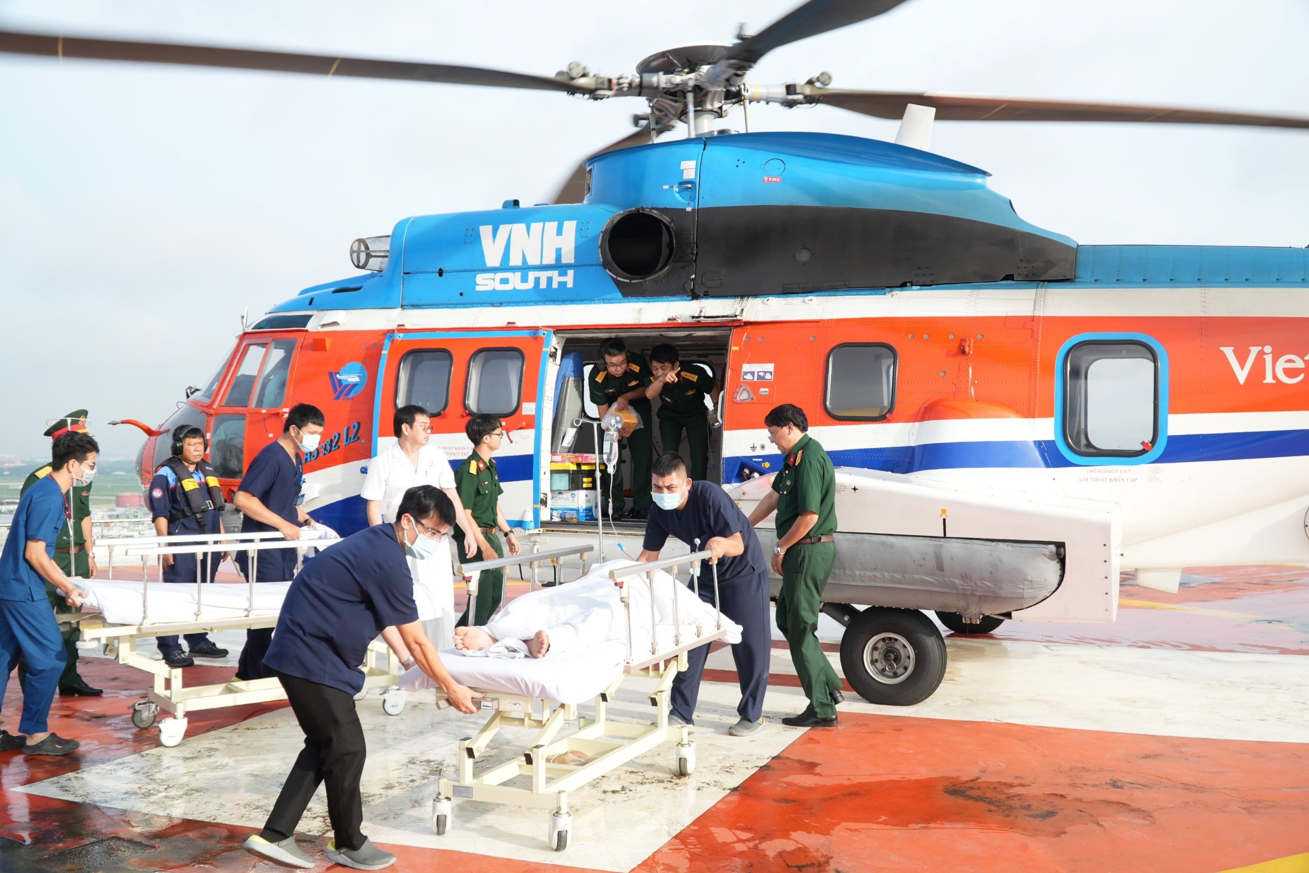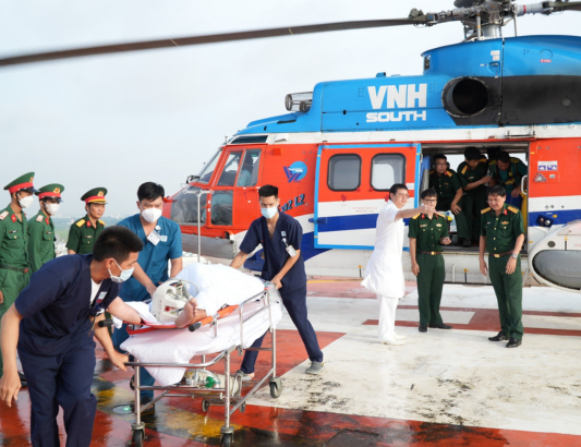 Sáng ngày 6/9, trực thăng Superpuma L2 số hiệu VN 8614 đã hạ cánh xuống sân đỗ tòa nhà Viện Chấn thương chỉnh hình, Tổ cấp cứu đường không Bệnh viện Quân y 175 đưa 3 ngư dân bị hội chứng giảm áp từ Trường Sa về đất liền điều trị.