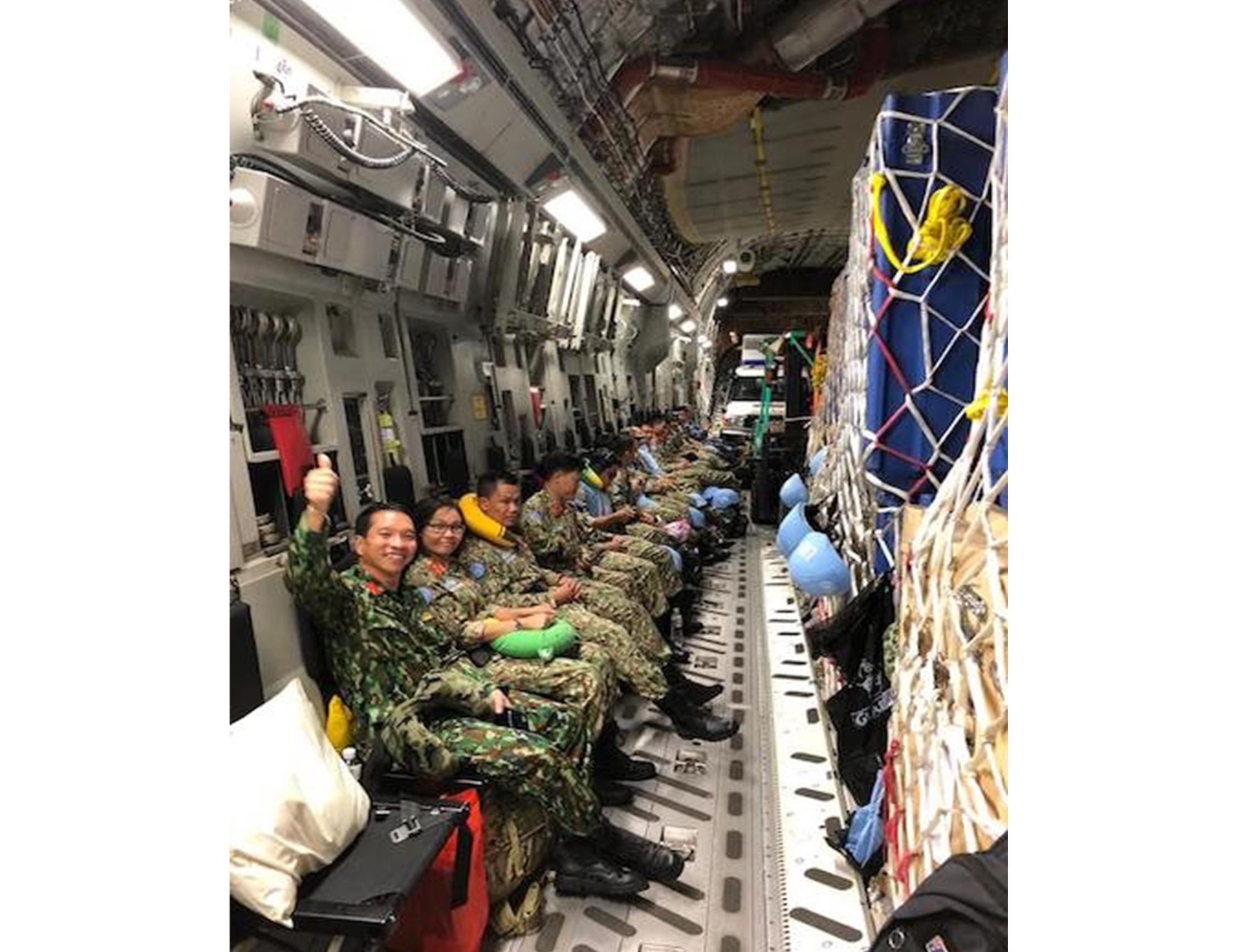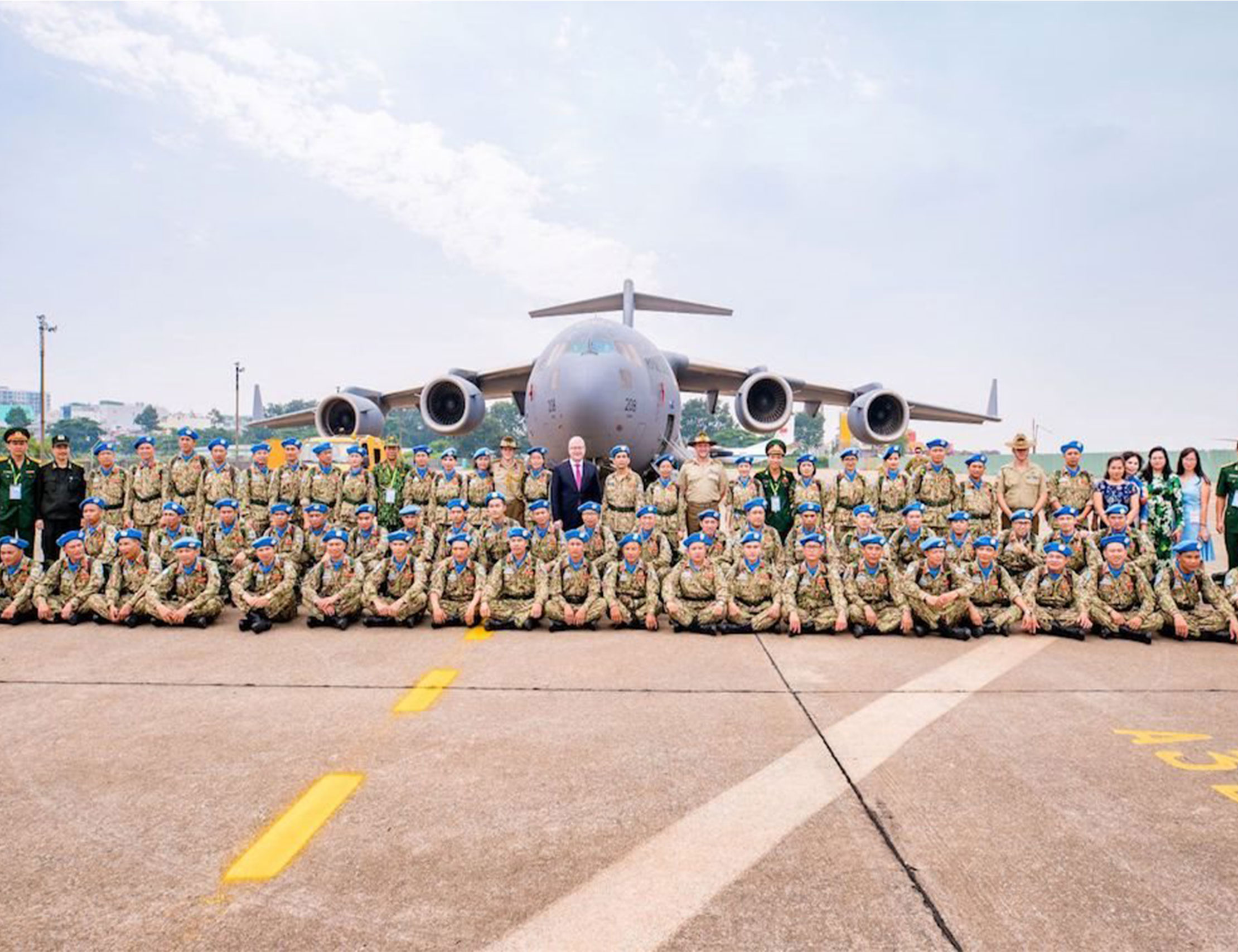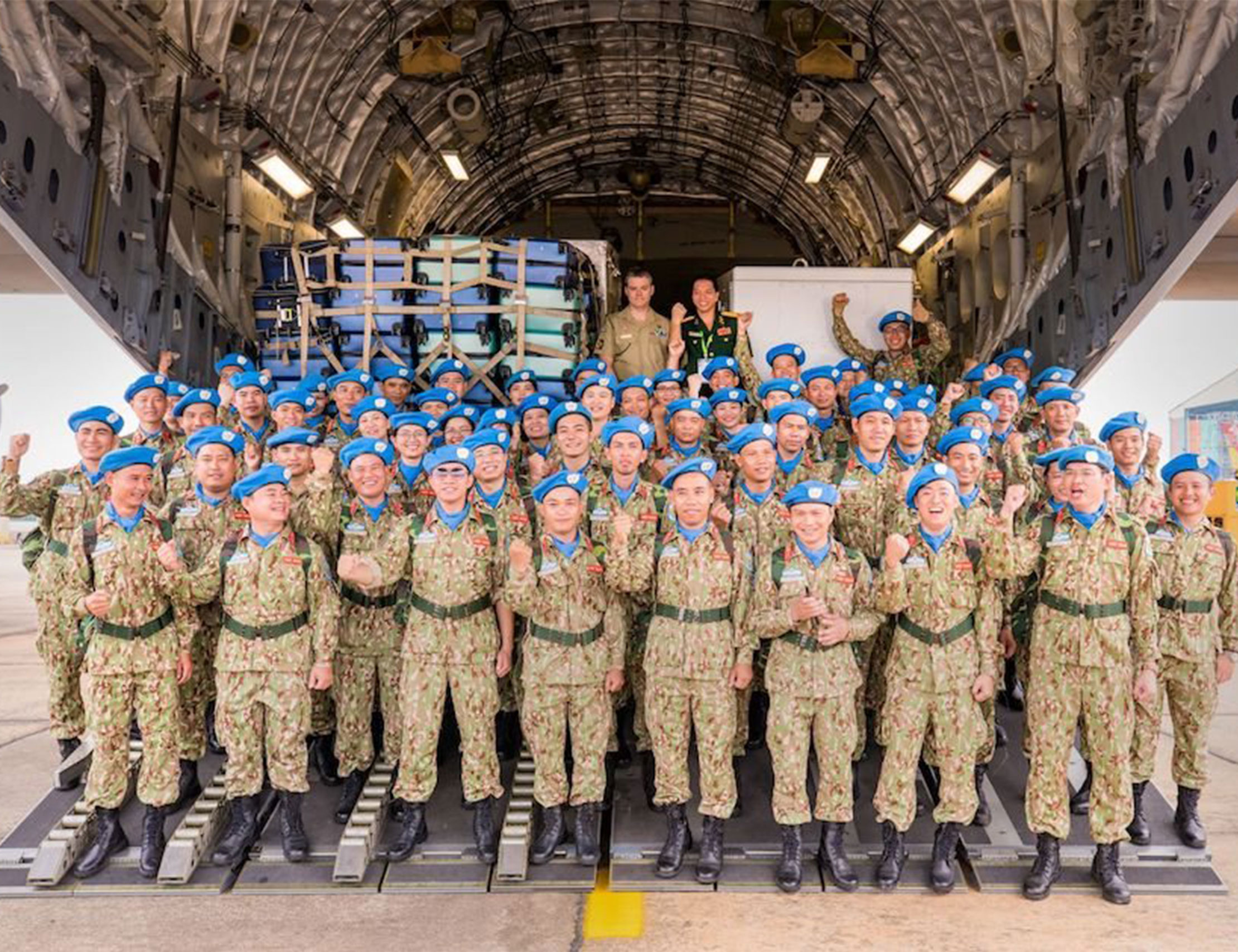 Đại tá, TSBS Trần Quốc Việt (Phó Giám đốc BV QY 175) và các quân nhân gìn giữ hòa bình Việt Nam trước giờ cất cánh.