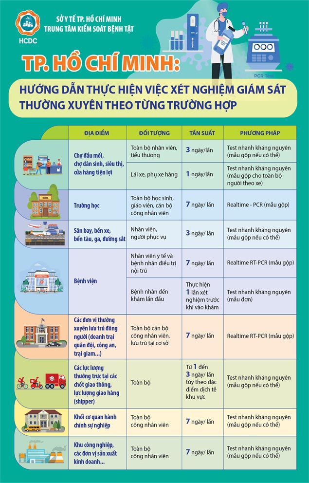 Tại các chợ đầu mối, chợ dân sinh, siêu thị, cửa hàng tiện lợi sẽ lấy mẫu toàn bộ nhân viên, tiểu thương bằng phương pháp test nhanh kháng nguyên mẫu gộp (nếu có thể) với tần suất 3 ngày/ lần. Đối với lái xe, phụ xe hàng sẽ thực hiện phương pháp test nhanh kháng nguyên mẫu gộp cho toàn bộ người theo xe mỗi ngày.