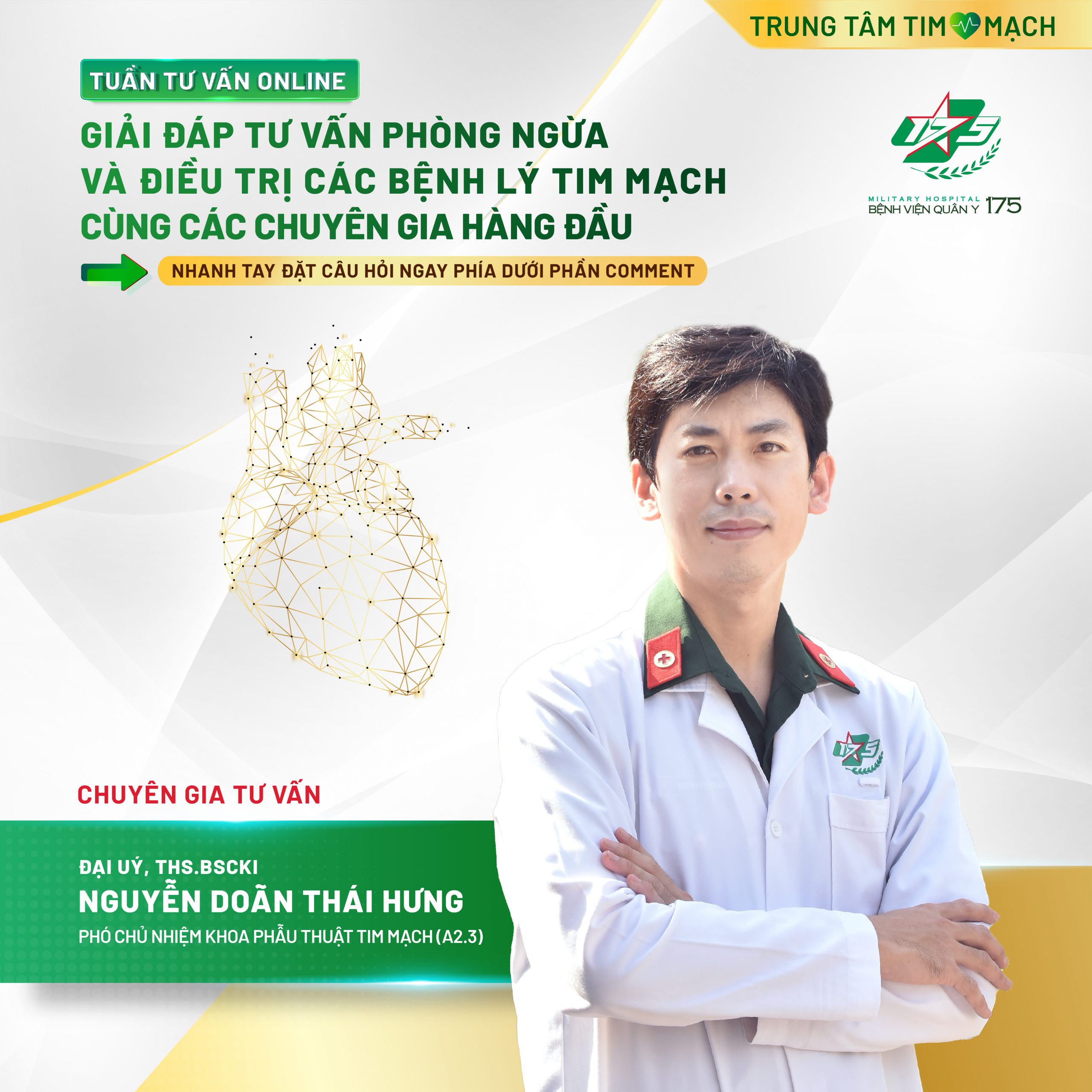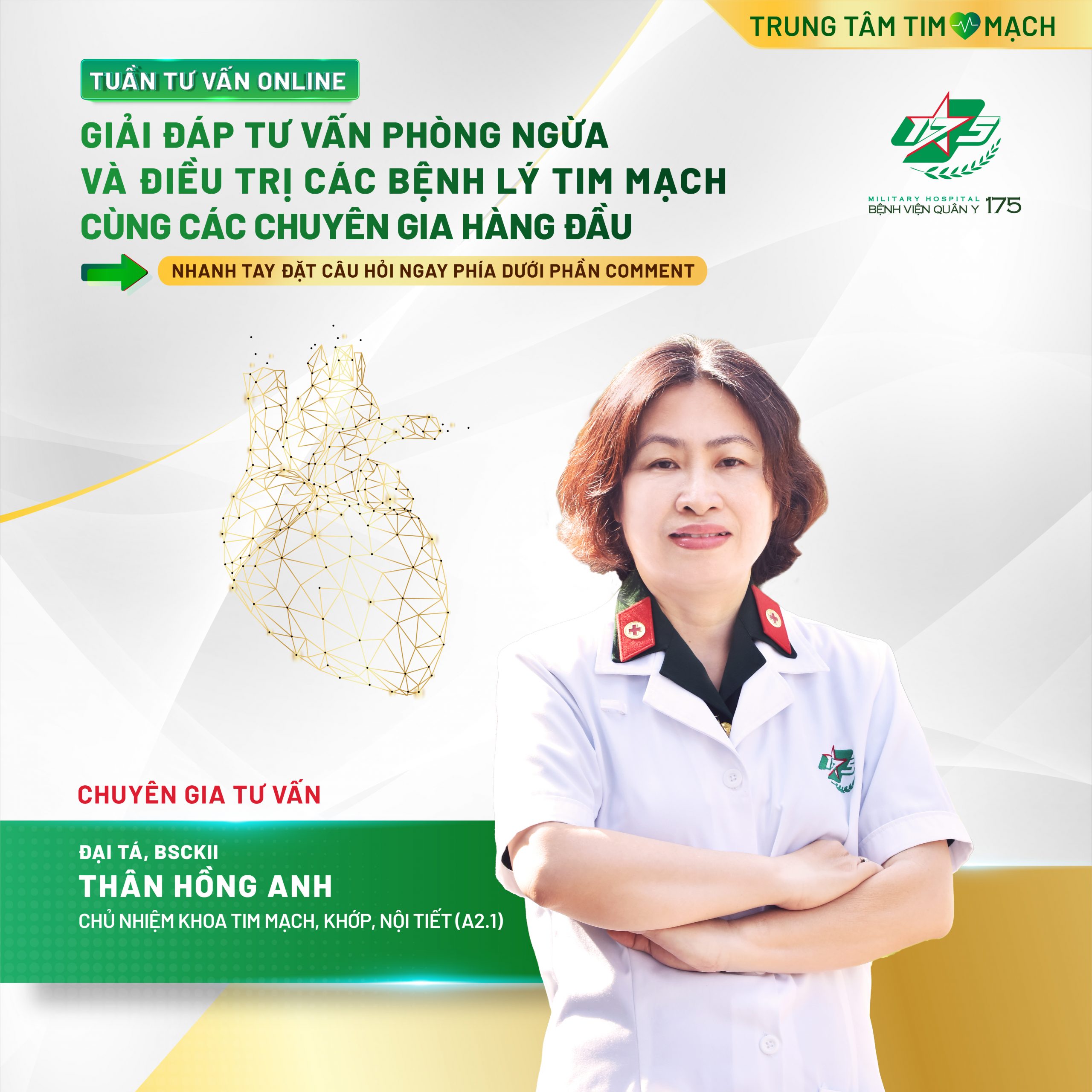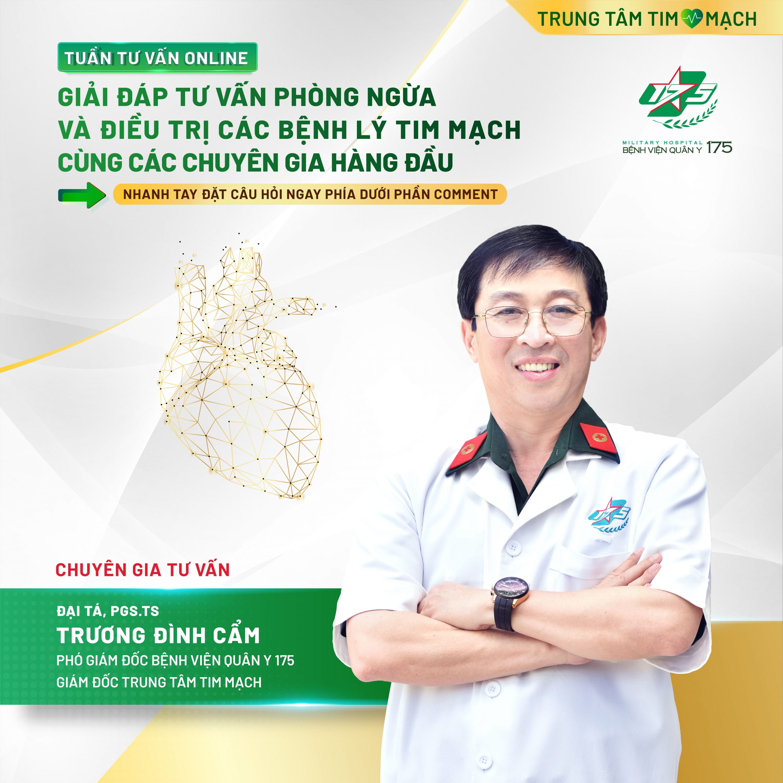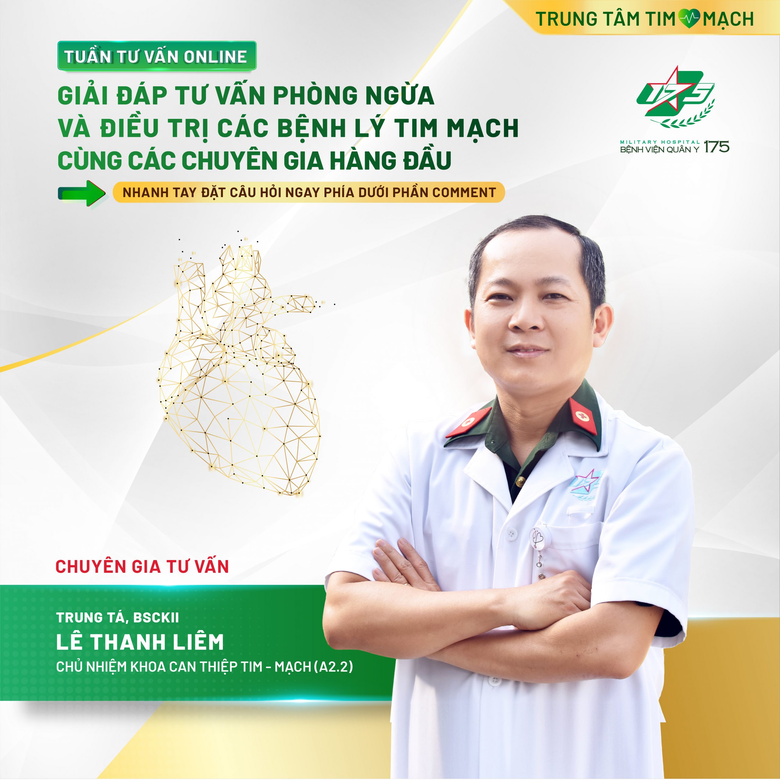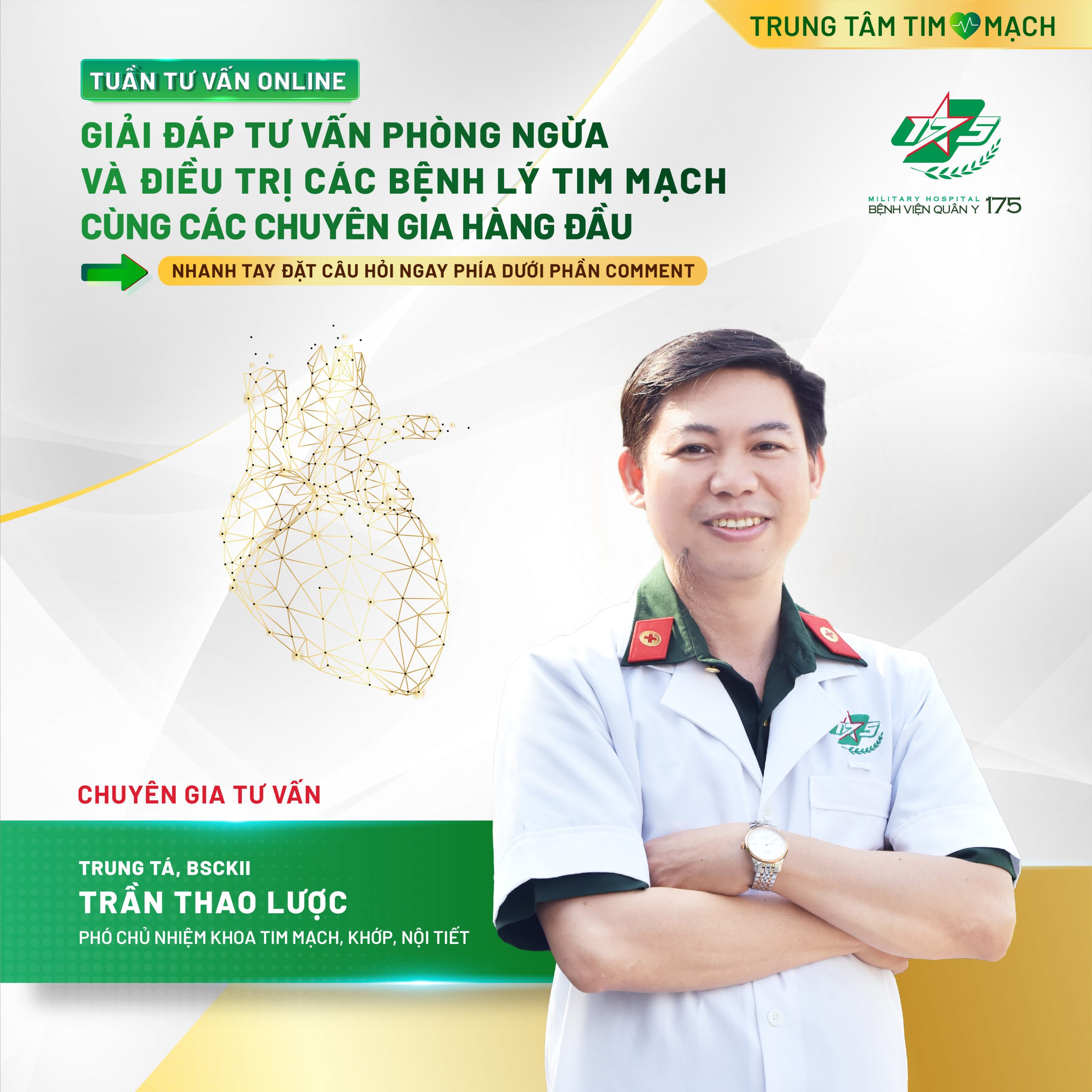 💥💥💥Hãy nhanh tay đặt câu hỏi gửi đến các chuyên gia những lo lắng, thắc mắc của bạn phía dưới phần Comment và chia sẻ TUẦN TƯ VẤN ONLINE đến với nhiều người, giúp mọi người bảo vệ sức khoẻ và nâng cao chất lượng cuộc sống, cũng như có cơ hội NHẬN NGAY VOUCHER để trải nghiệm dịch vụ tại Trung tâm Tim mạch – Bệnh viện Quân y 175!
