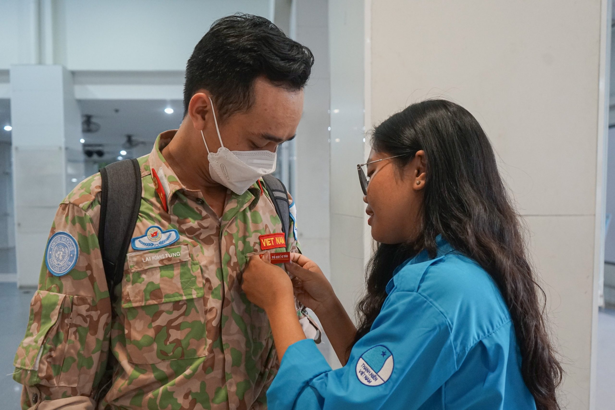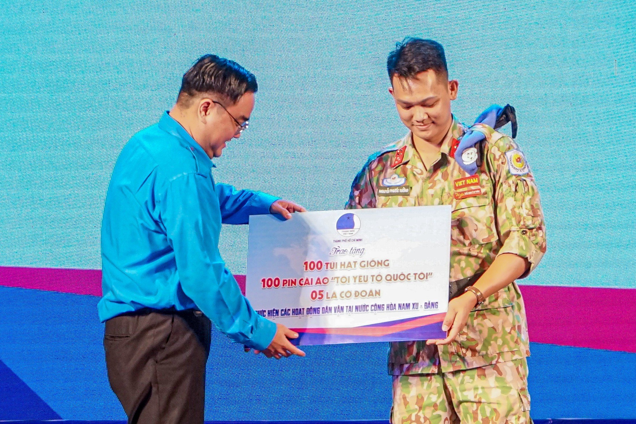 Đặc biệt, thanh niên TPHCM đã trao tặng cho những Người lính mũ nồi xanh chiếc khăn rằn như một món quà thân thương mà hậu phương gửi tặng các chiến sĩ trước lúc lên đường thực hiện nhiệm vụ.