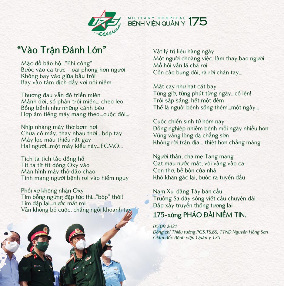 Lễ khai giảng đặc biệt “ai ở đâu khai giảng ở đó” diễn ra khi cả nước đang gồng mình phòng chống dịch bệnh Covid-19 với những diễn biến rất phức tạp, khó lường. Chia sẻ cùng CBCNV khi con trẻ không được đến trường, không được ở bên con chuẩn bị quần áo, sách vở và dụng cụ học tập,… Đồng chí Thiếu tướng TS.BS Nguyễn Hồng Sơn – Giám đốc Bệnh viện Quân y 175 trân trọng dành tặng bài thơ “Vào Trận Đánh Lớn” như gửi gắm liều thuốc tinh thần động viên y bác sỹ tuyến đầu vững vàng, mạnh mẽ vượt qua muôn ngàn thách thức.