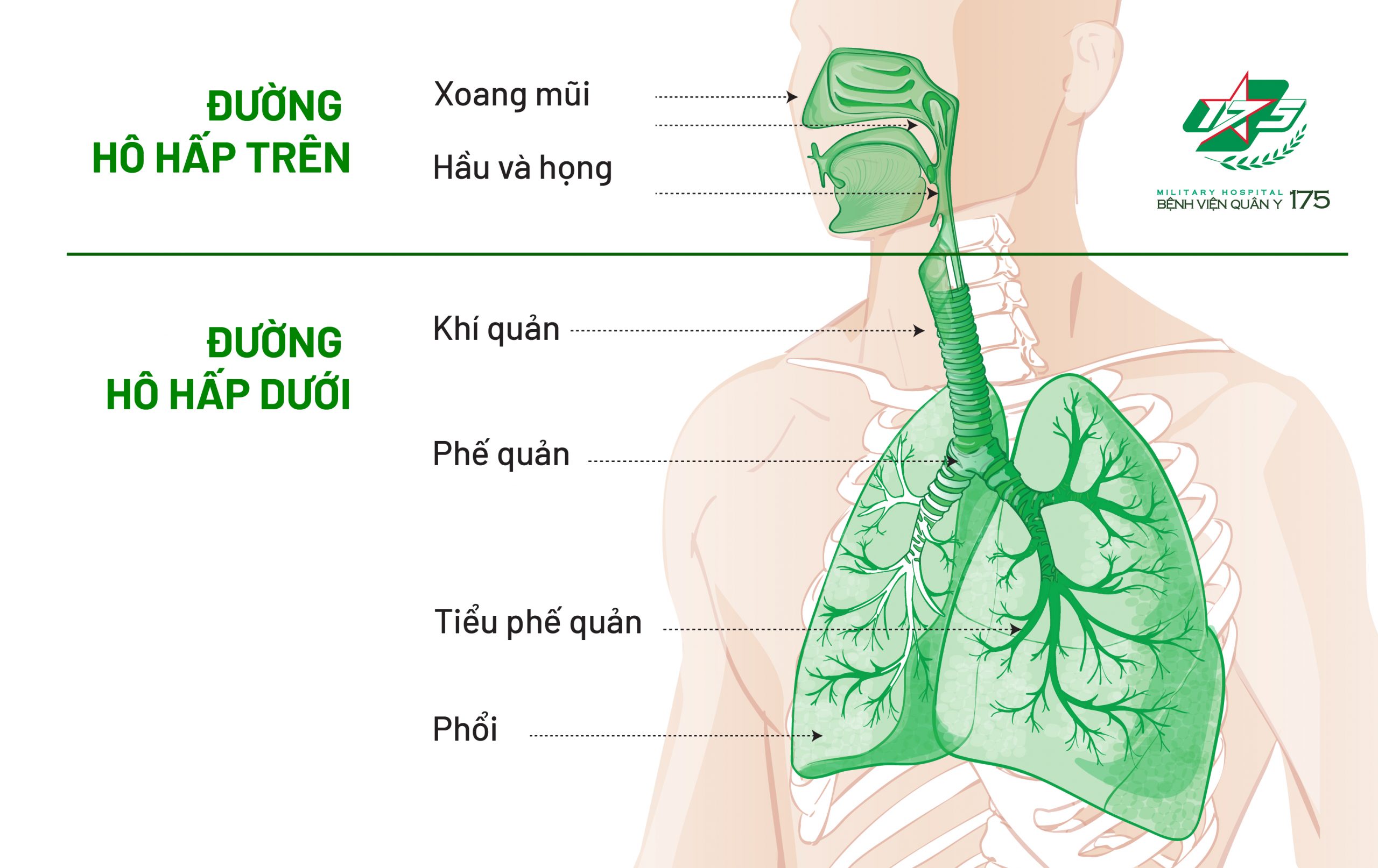 Hệ hô hấp của chúng ta được tính bắt đầu từ cửa mũi tới các phế nang trong phổi. Đường hô hấp trên gồm hầu, mũi, xoang và thanh quản. Chức năng của đường hô hấp trên là lấy không khí từ ngoài cơ thể là làm ẩm, sưởi ấm và lọc không khí trước khi đưa vào phổi, còn các bộ phận của đường hô hấp dưới giúp lọc không khí và trao đổi không khí.