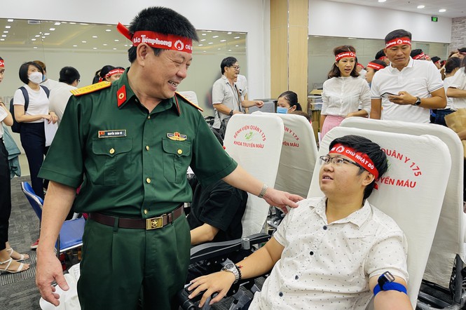 Đại tá, bác sĩ Nguyễn Xuân Vũ – Trưởng Ban Tiếp máu – Bệnh viện Quân y 175 động viên các bạn trẻ tham gia hiến máu.