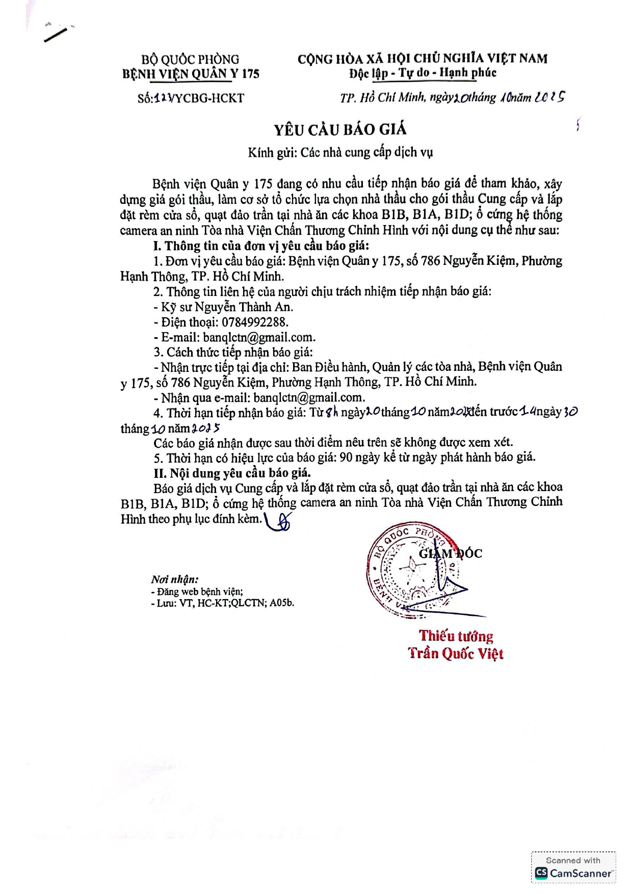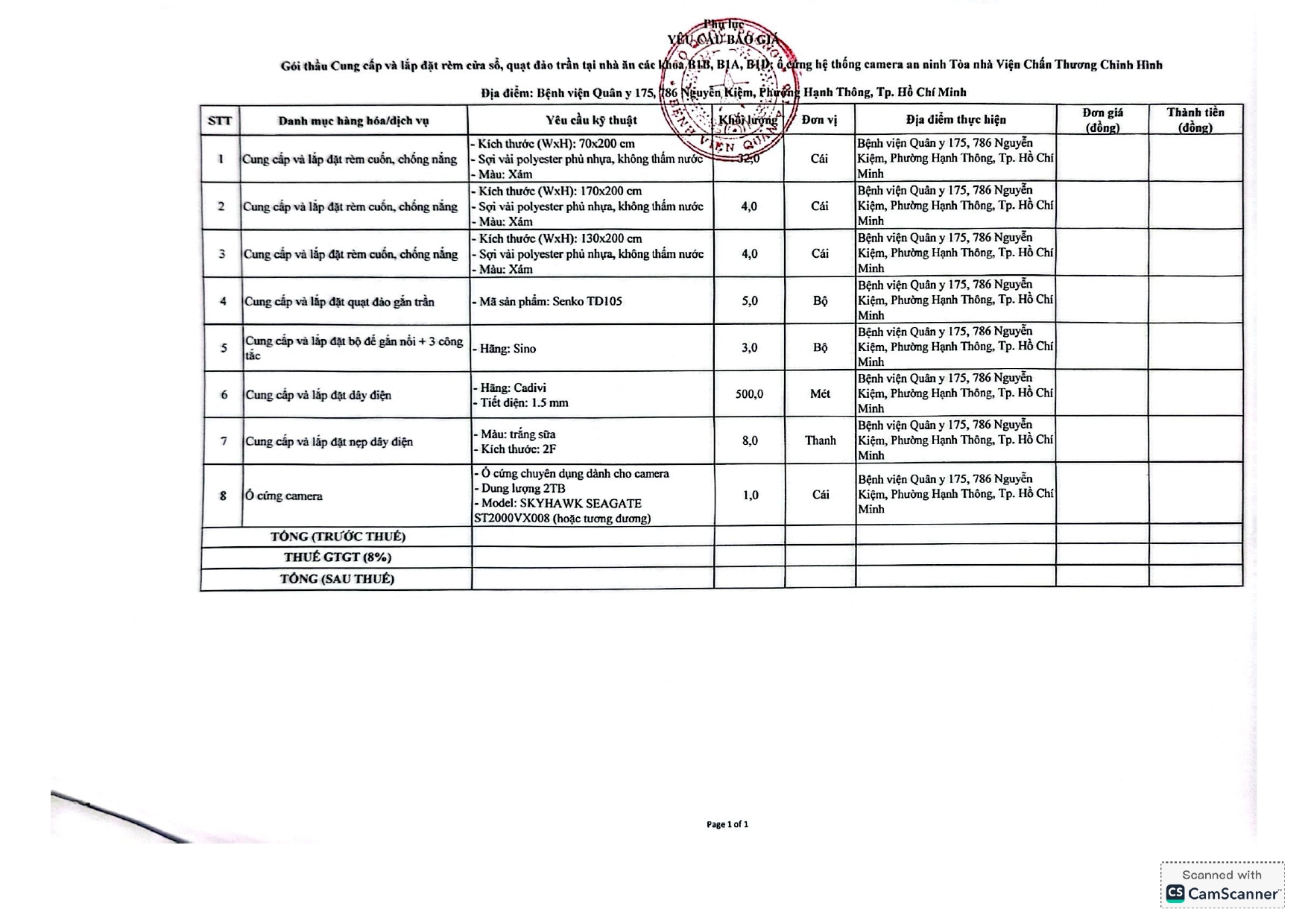 Bệnh viện Quân y 175 đang có nhu cầu tiếp nhận báo giá để tham khảo, xây dựng giá gói thầu, làm cơ sở tổ chức lựa chọn nhà thầu cho gói thầu Cung cấp và lắp đặt rèm cửa sổ, quạt đảo trần tại nhà ăn các khoa B1B, B1A, B1D, ổ cứng hệ thống camera an ninh tòa nhà Viện CTCH.
