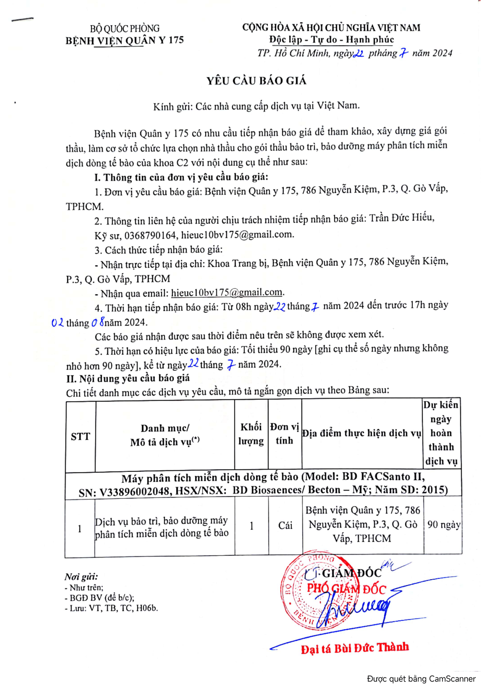 - Đơn vị yêu cầu báo giá: Bệnh viện Quân y 175, 786 Nguyễn Kiệm, P.3, Q. Gò Vấp, TPHCM.