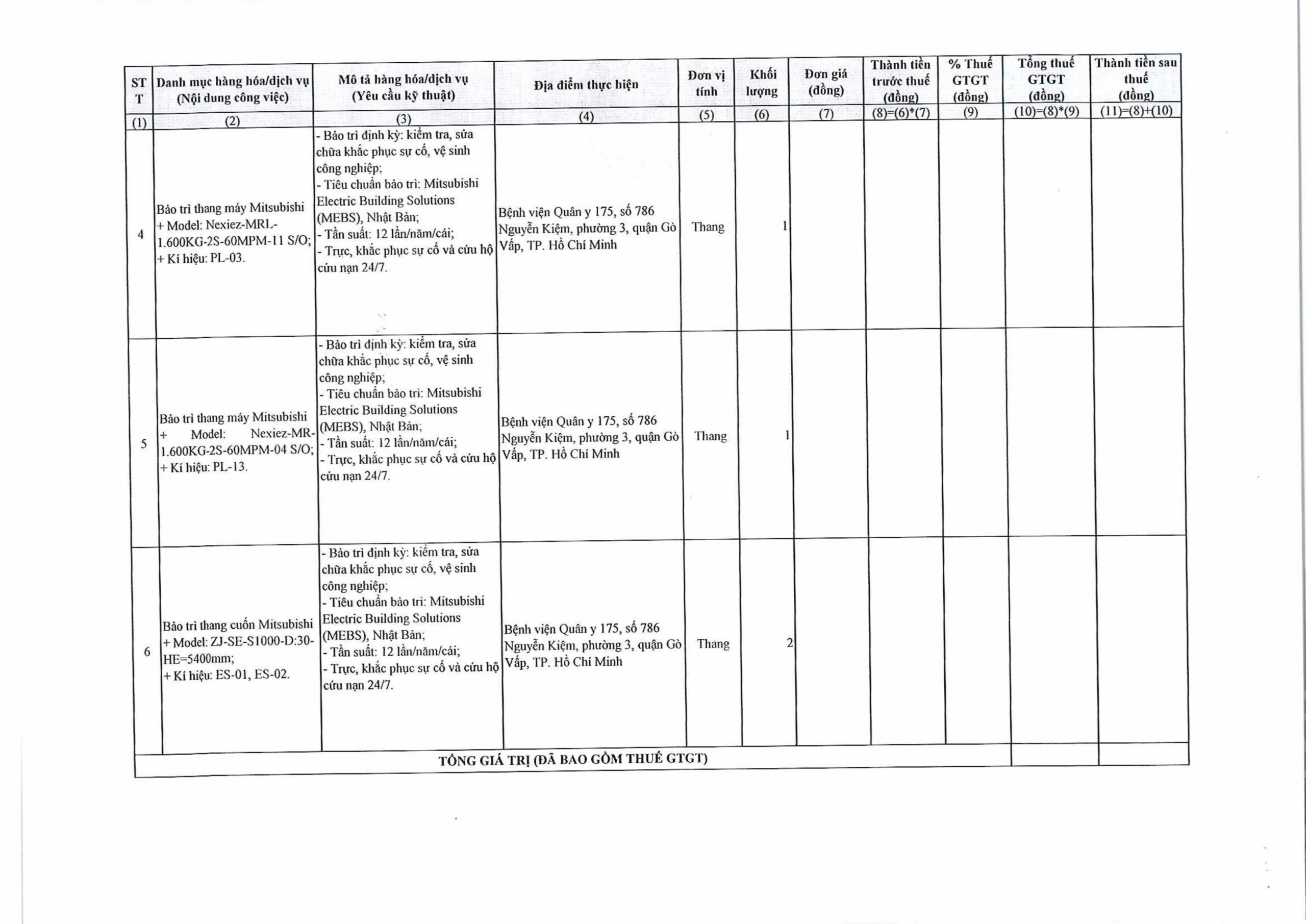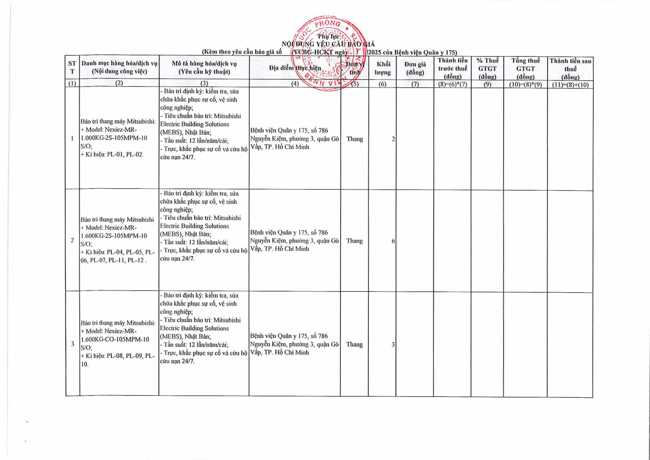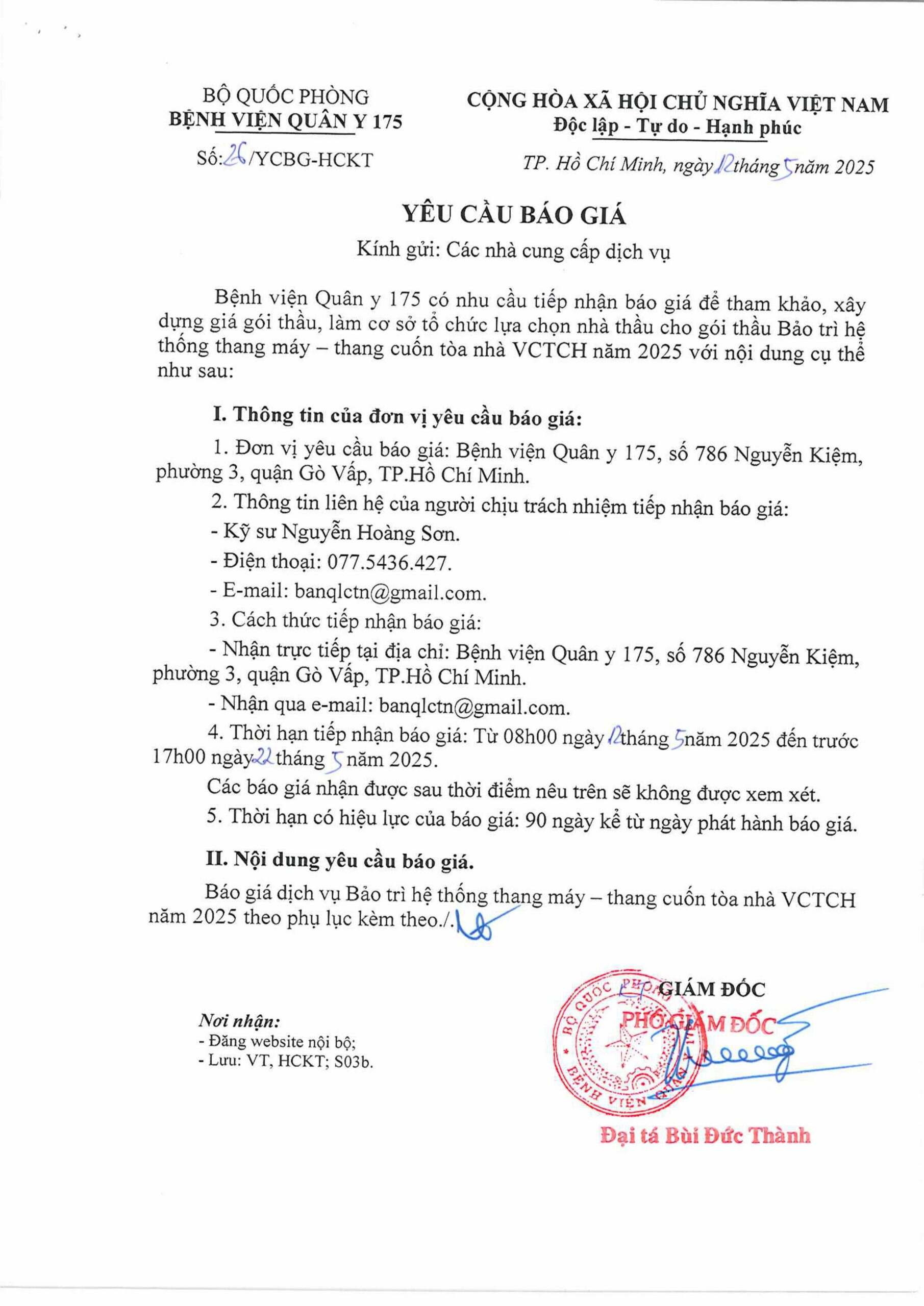 Bệnh viện Quân y 175 có nhu cầu tiếp nhận báo giá để tham khảo, xây dựng giá gói thầu, làm cơ sở tổ chức lựa chọn nhà thầu cho gói thầu Bảo trì hệ thống thang máy – thang cuốn Toà nhà VCTCH năm 2025.