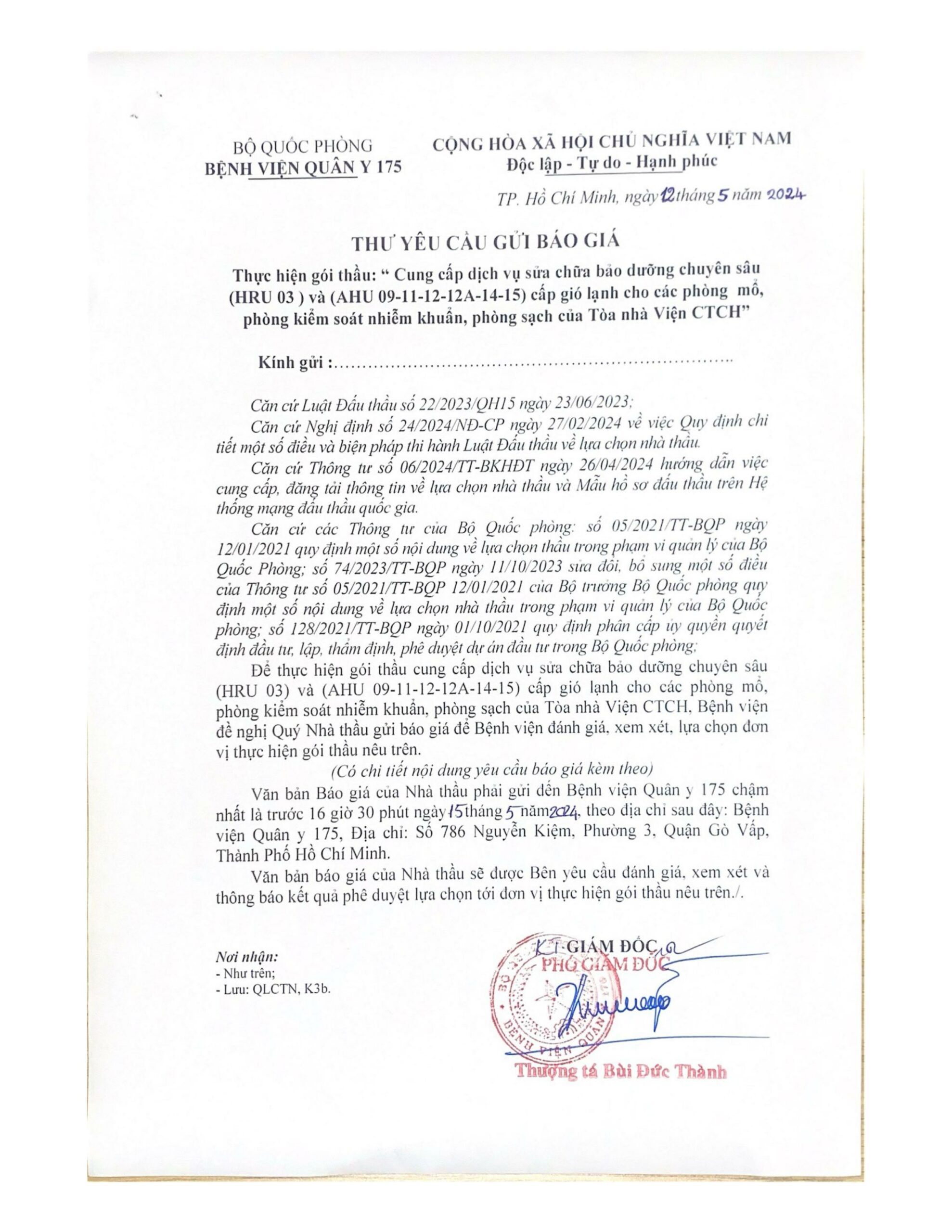Bệnh viện Quân y 175 có nhu cầu tiếp nhận báo giá để tham khảo, xây dựng giá gói thầu, làm cơ sở tổ chức lựa chọn nhà thầu cho gói thầu : “ Cung cấp dịch vụ sửa chữa bảo dưỡng chuyên sâu (HRU 03 ) và (AHU 09-11-12-12A-14-15) cấp gió lạnh cho các phòng mổ, phòng kiểm soát nhiễm khuẩn, phòng sạch của Tòa nhà Viện CTCH”