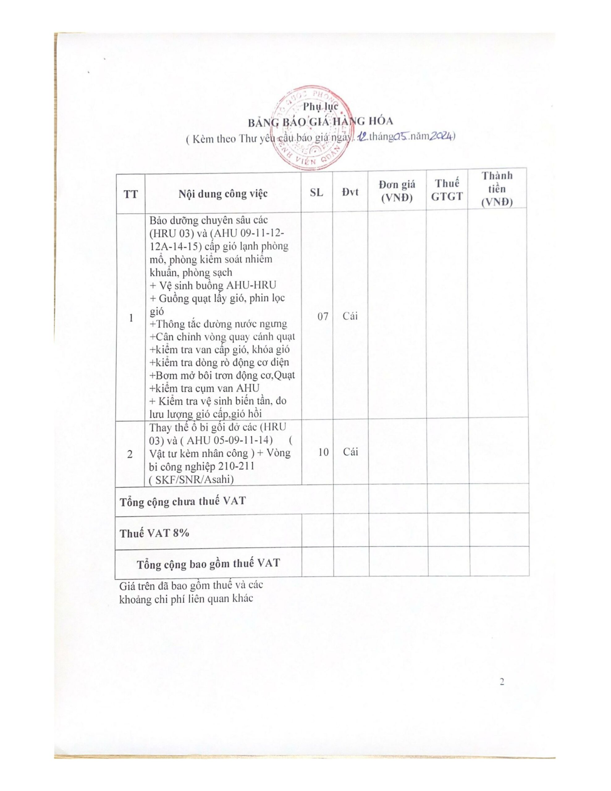 Yêu cầu báo giá cho gói thầu: “ Cung cấp dịch vụ sửa chữa bảo dưỡng chuyên sâu (HRU 03 ) và (AHU 09-11-12-12A-14-15) cấp gió lạnh cho các phòng mổ, phòng kiểm soát nhiễm khuẩn, phòng sạch của Tòa nhà Viện CTCH”