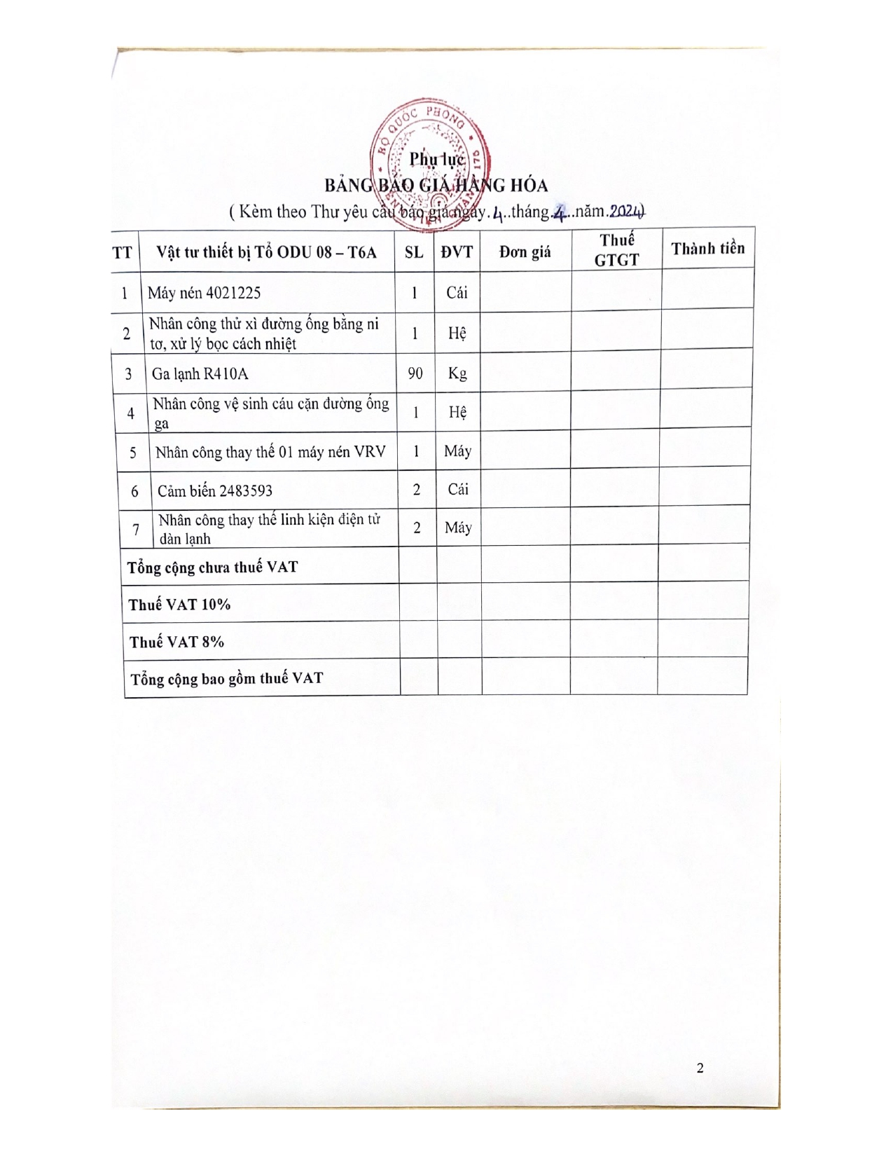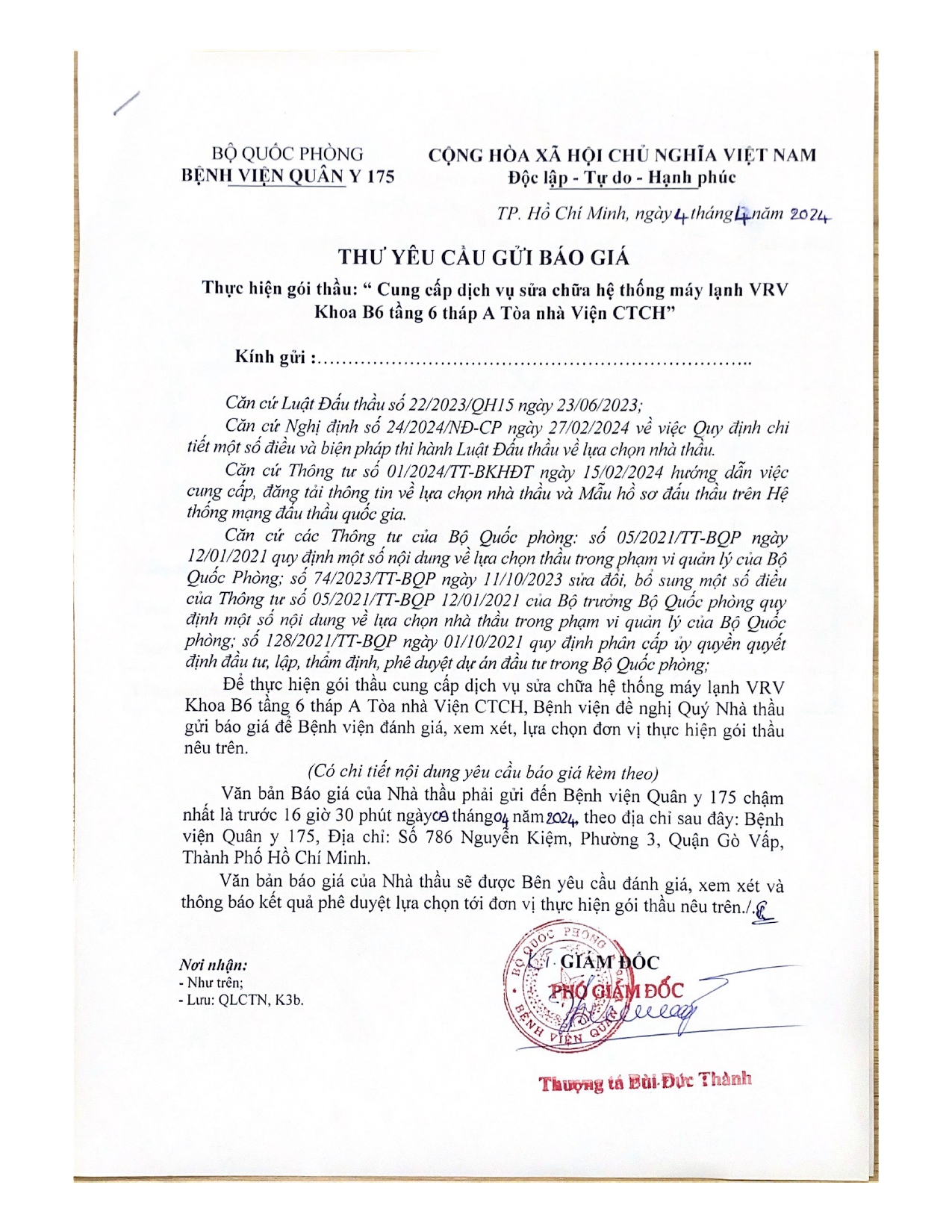 Bệnh viện Quân y 175 có nhu cầu tiếp nhận báo giá để tham khảo, xây dựng giá gói thầu, làm cơ sở tổ chức lựa chọn nhà thầu cho gói thầu :”Cung cấp dịch vụ sửa chữa hệ thống máy lạnh VRV Khoa B6 tầng 6 tháp A Tòa nhà Viện CTCH”