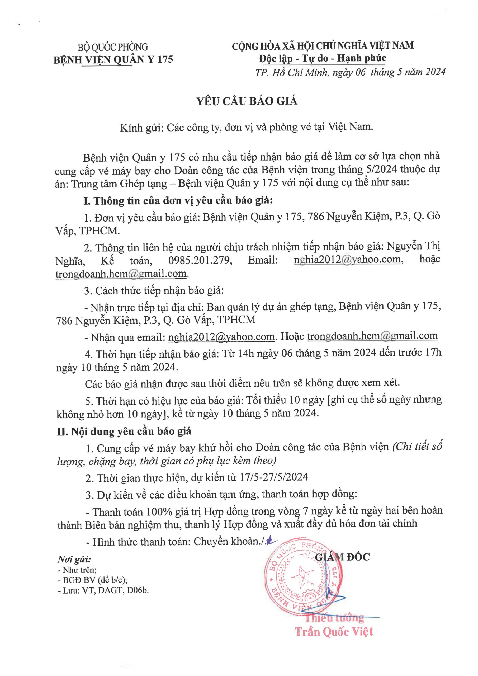 Bệnh viện Quân y 175 có nhu cầu tiếp nhận báo giá để tham khảo, xây dựng giá gói thầu, làm cơ sở tổ chức lựa chọn nhà thầu cho gói thầu cung cấp vé máy bay cho Đoàn công tác trong tháng 5/2024.