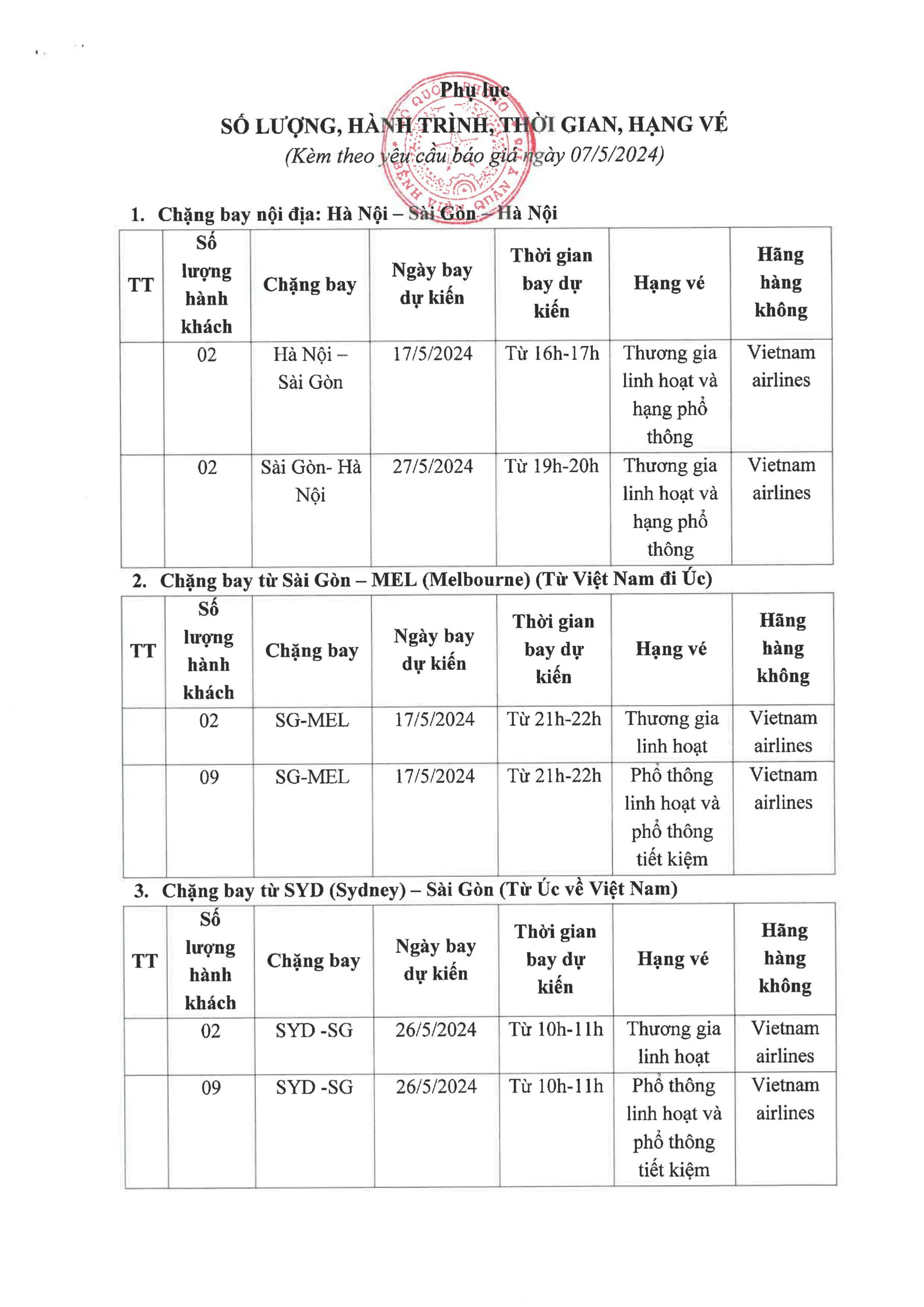 Yêu cầu báo giá cho gói thầu cung cấp vé máy bay cho Đoàn công tác trong tháng 5/2024