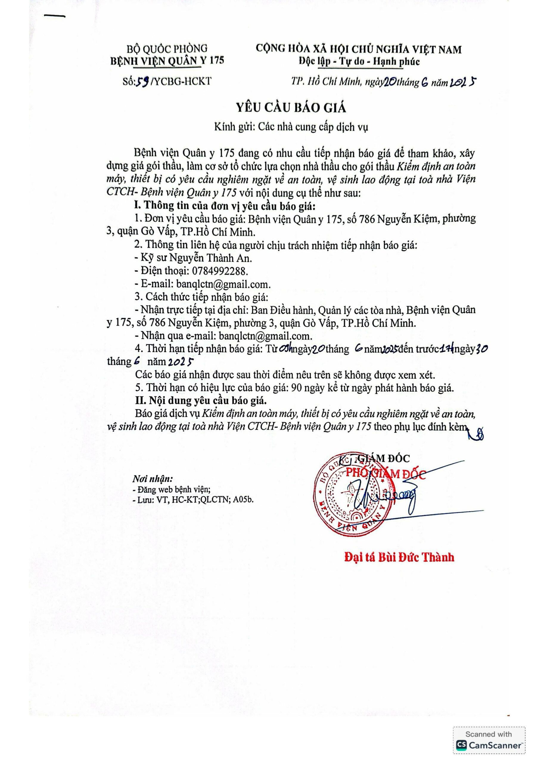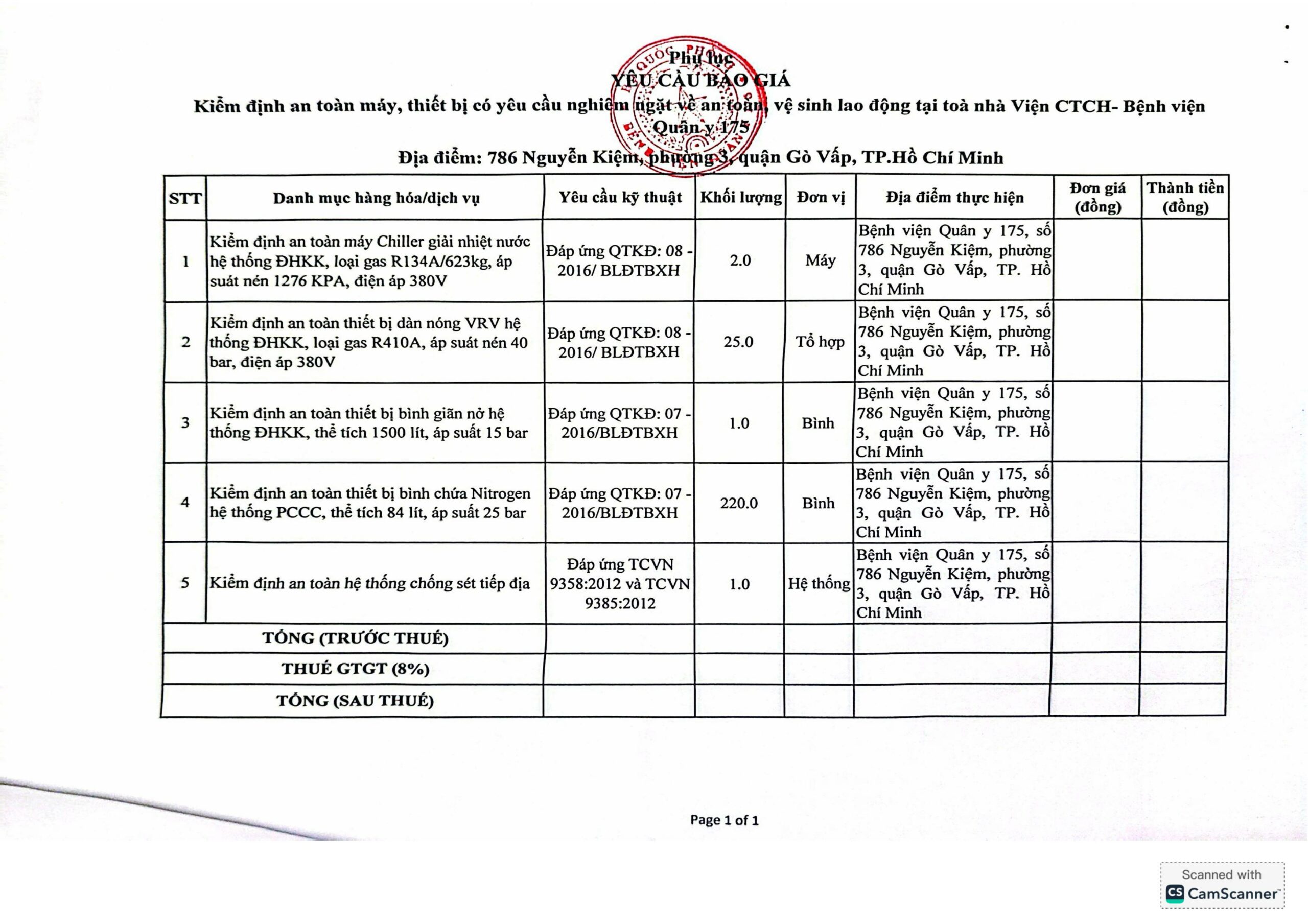 Bệnh viện Quân y 175 đang có nhu cầu tiếp nhận báo giá để tham khảo, xây dựng gói thầu làm cơ sở tổ chức lựa chọn nhà thầu cho gói thầu Kiểm định an toàn máy, thiết bị có yêu cầu nghiêm ngặt về an toàn, vệ sinh lao động tại tòa nhà Viện CTCH- BVQY 175.