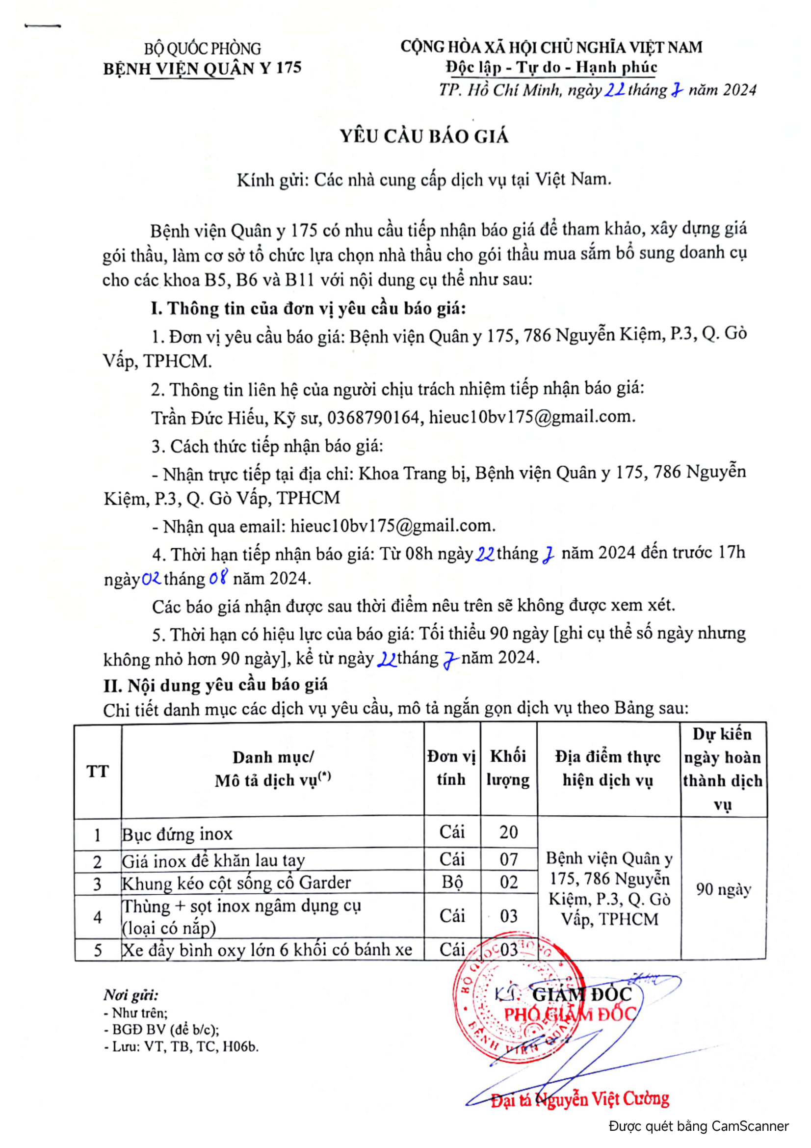 - Đơn vị yêu cầu báo giá: Bệnh viện Quân y 175, 786 Nguyễn Kiệm, P.3, Q. Gò Vấp, TPHCM.