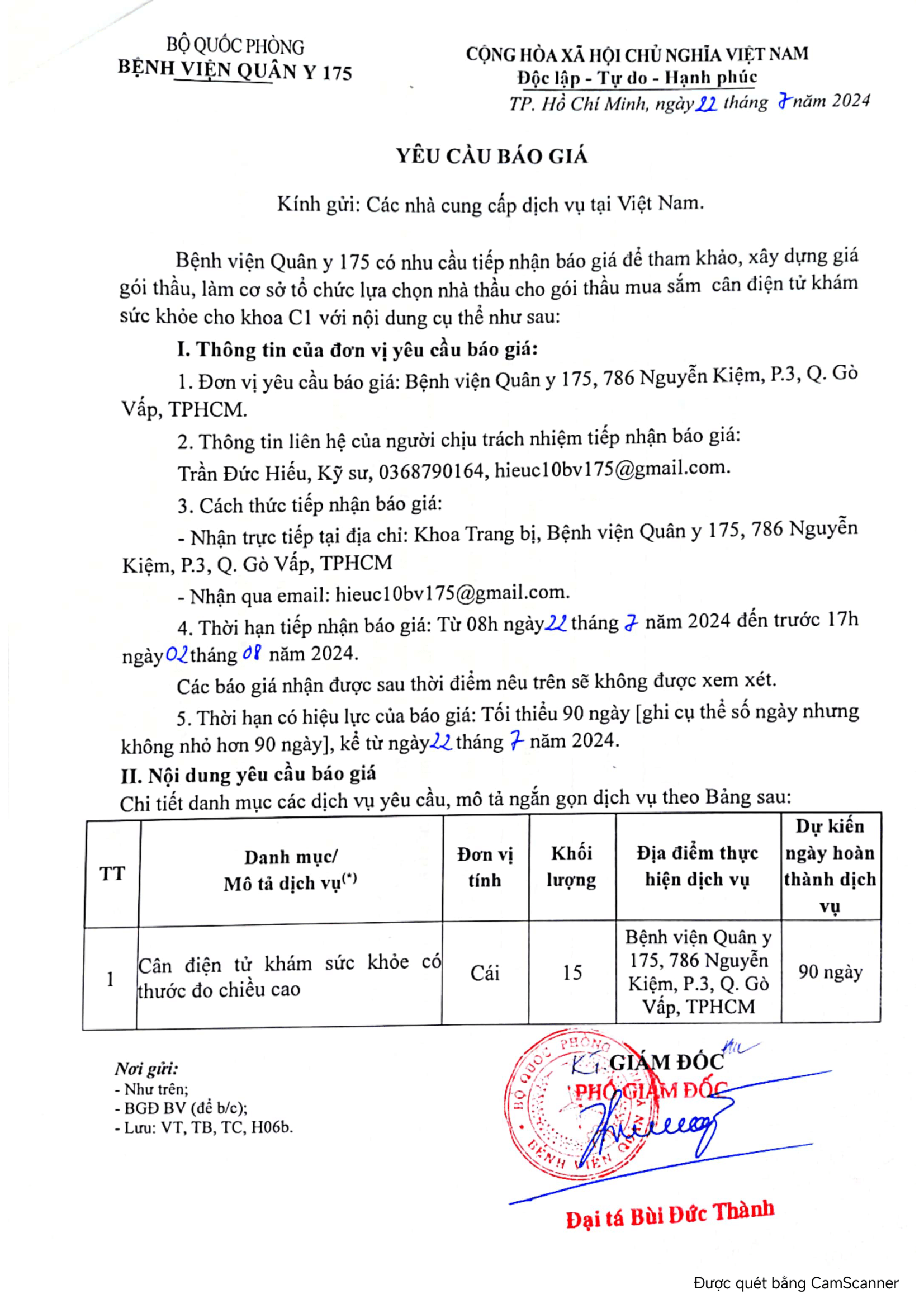 - Đơn vị yêu cầu báo giá: Bệnh viện Quân y 175, 786 Nguyễn Kiệm, P.3, Q. Gò Vấp, TPHCM.