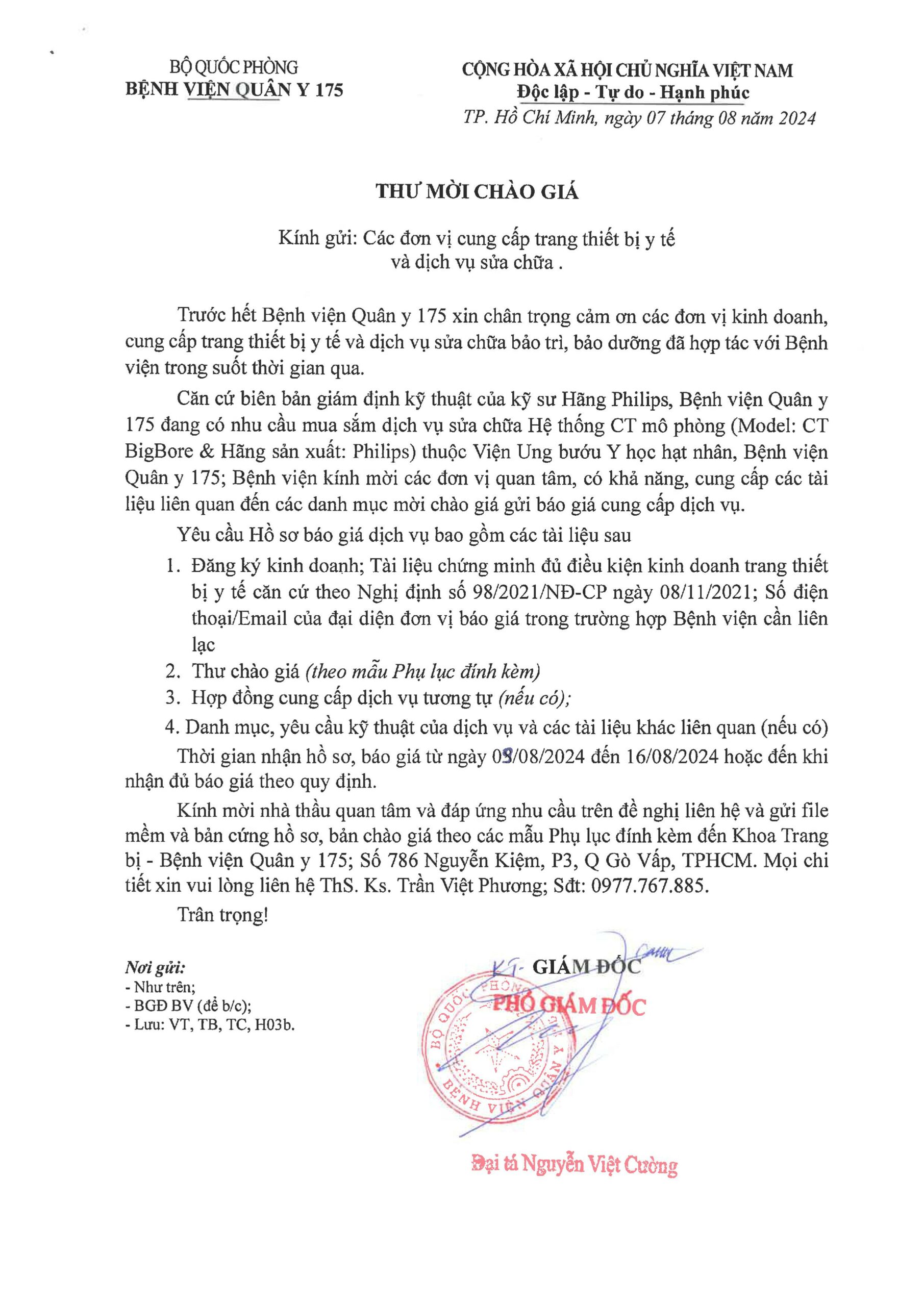 Kính mời nhà thầu quan tâm và đáp ứng nhu cầu trên đề nghị liên hệ và gửi file mềm và bản cứng hồ sơ, bản chào giá theo các mẫu Phụ lục đính kèm đến Khoa Trang bị – Bệnh viện Quân y 175; Số 786 Nguyễn Kiệm, P3, Q Gò Vấp, TPHCM. Mọi chi tiết xin vui lòng liên hệ ThS. Ks. Trần Việt Phương; Sđt: 0977.767.885.
