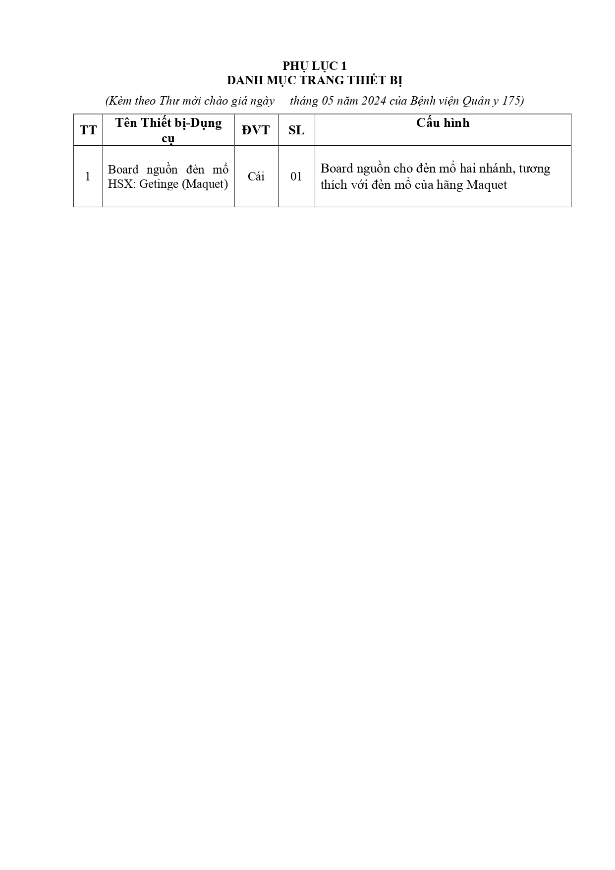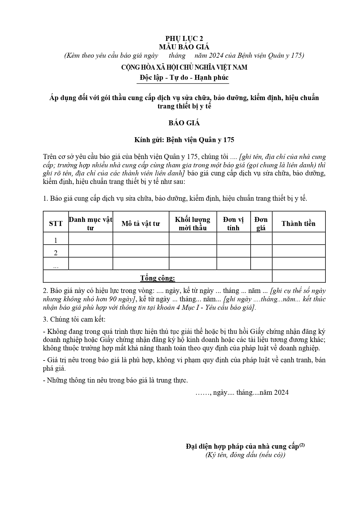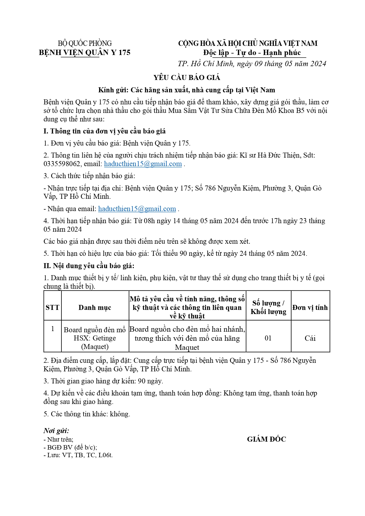 - Đơn vị yêu cầu báo giá: Bệnh viện Quân y 175.