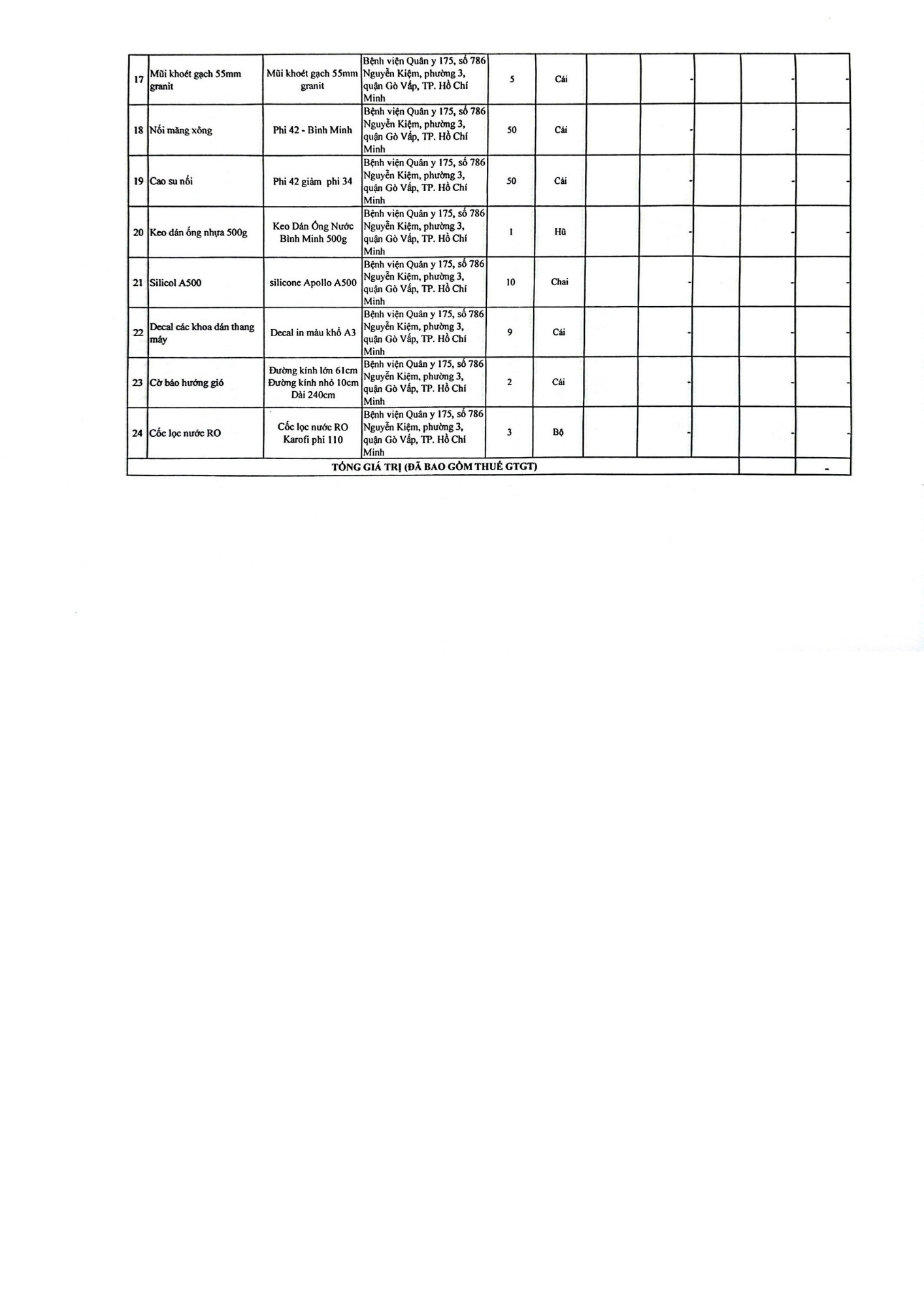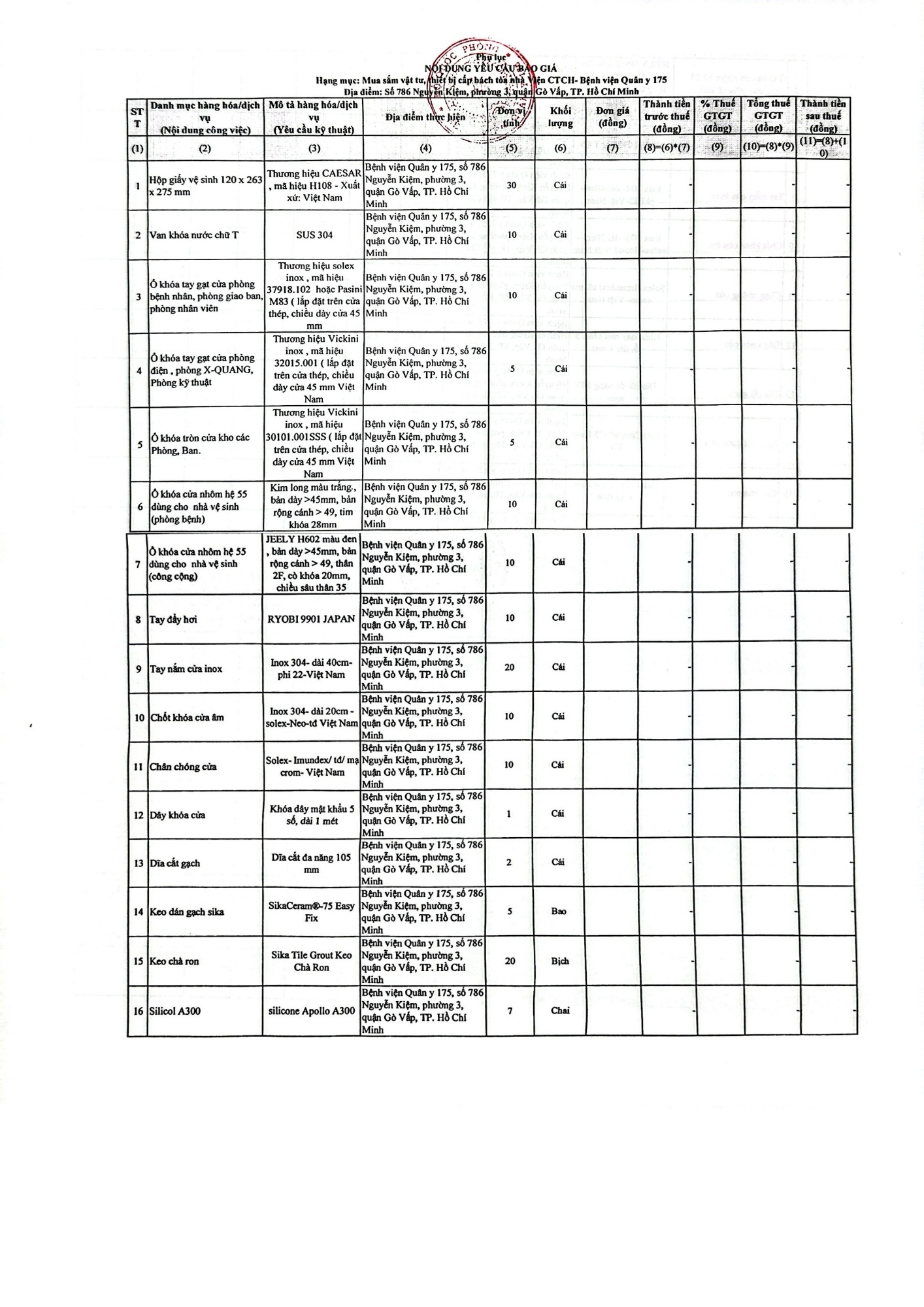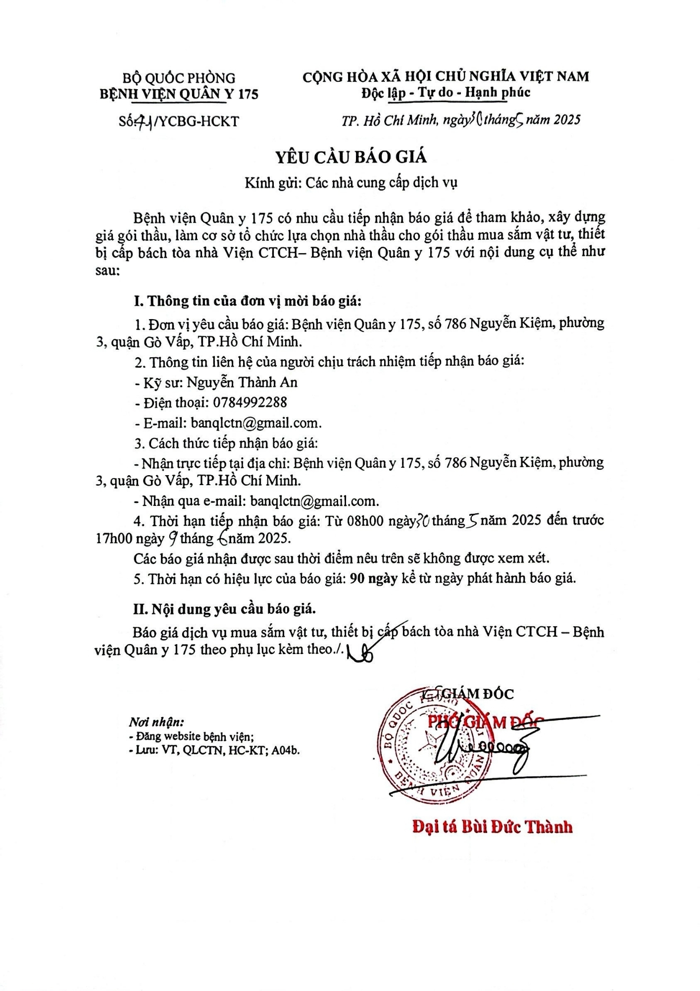 Bệnh viện Quân y 175 có nhu cầu tiếp nhận báo giá để tham khảo, xây dựng giá gói thầu, làm cơ sở tổ chức lựa chọn nhà thầu cho gói thầu Mua sắm vật tư, thiết bị cấp bách toà nhà Viện Chấn thương chỉnh hình.