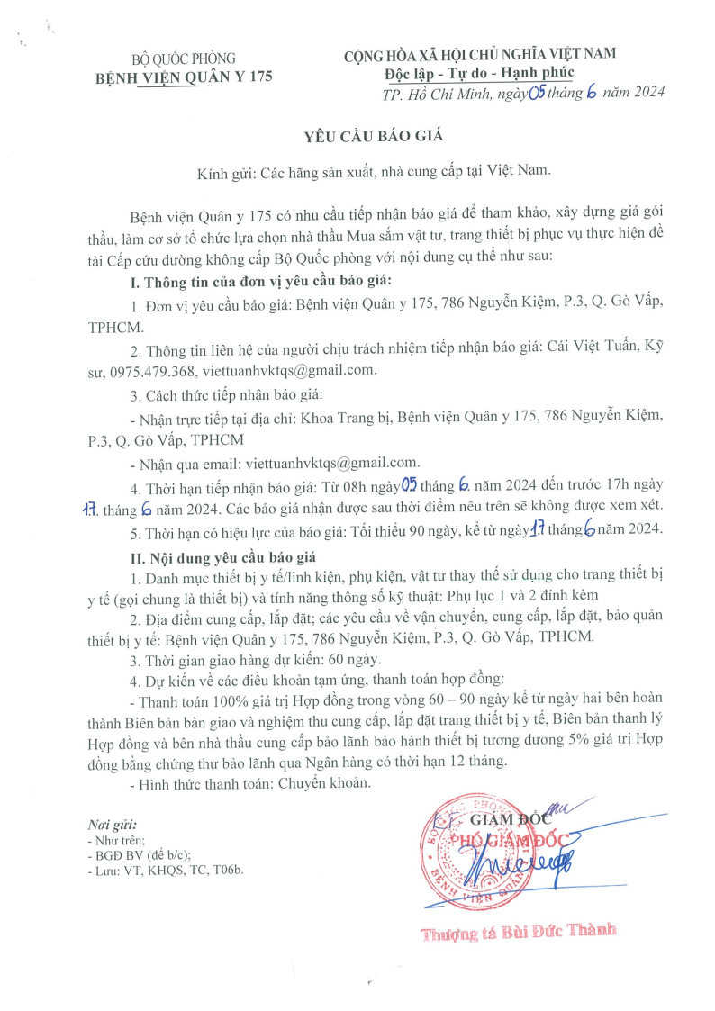 - Đơn vị yêu cầu báo giá: Bệnh viện Quân y 175, 786 Nguyễn Kiệm, P.3, Q. Gò Vấp, TPHCM.