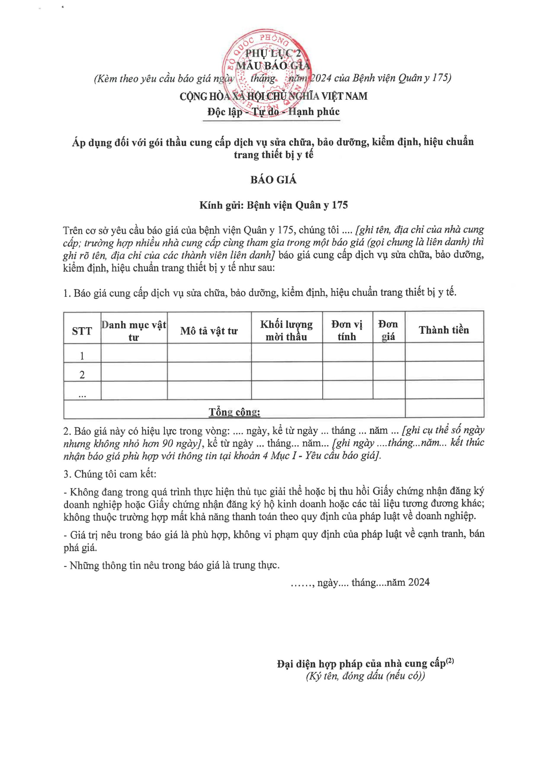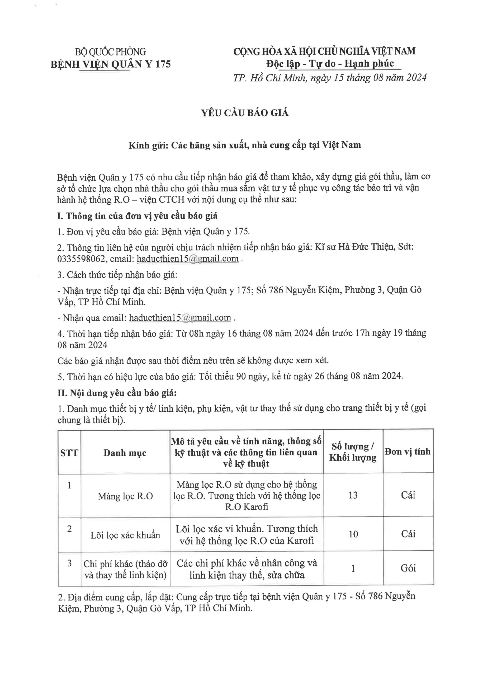 Bệnh viện Quân y 175 có nhu cầu tiếp nhận báo giá để tham khảo, xây dựng giá gói thầu,làm cơ sở tổ chức lựa chọn nhà thầu cho gói thầu mua sắm vật tư y tế phục vụ công tác bảo trì và vận hành hệ thống R.O- Viện CTCH.