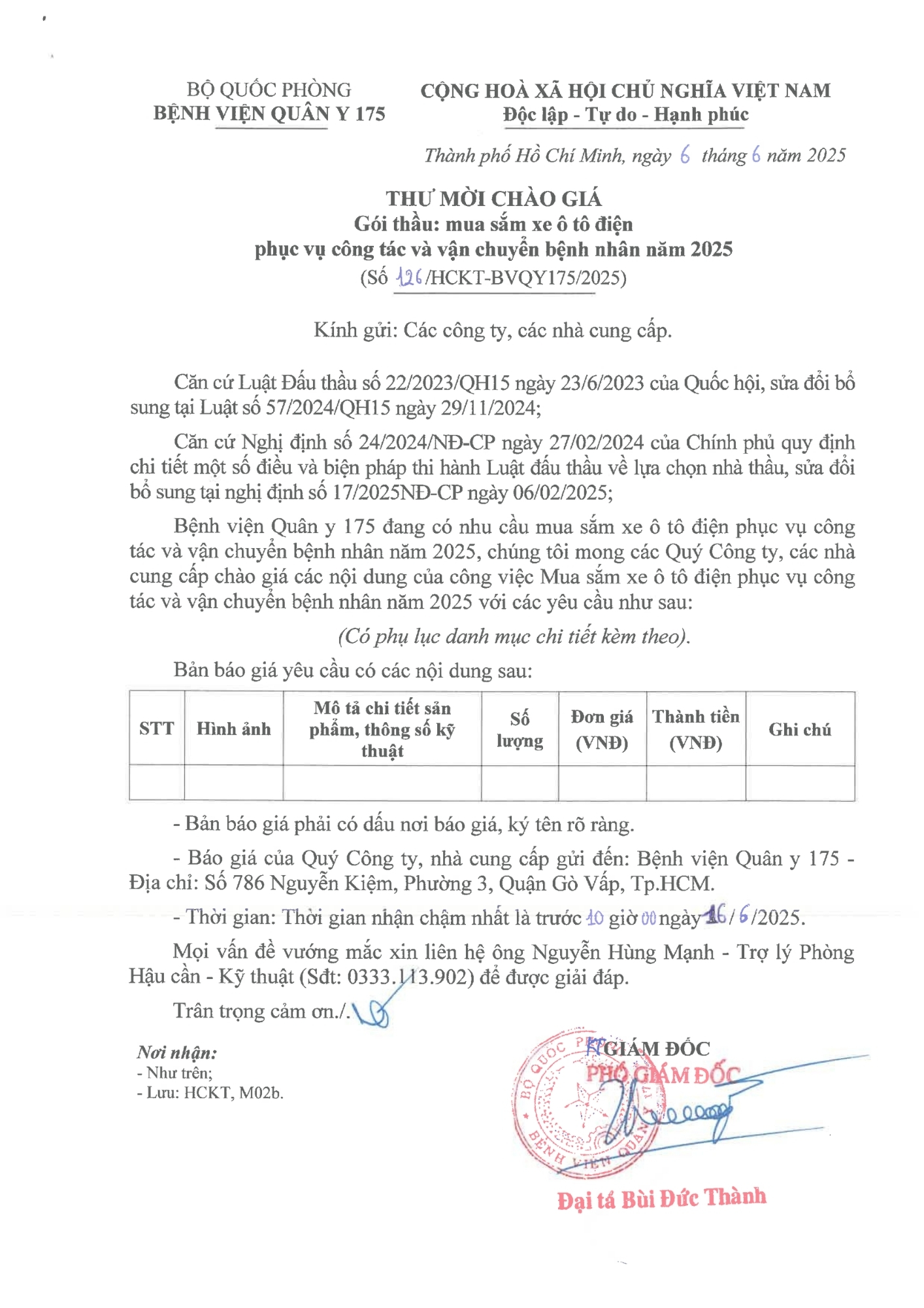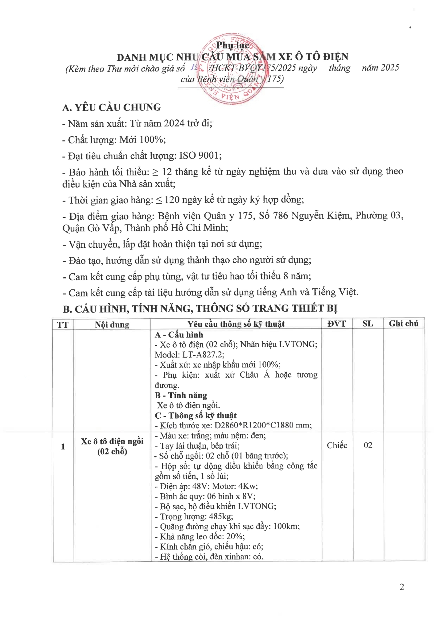 Bệnh viện Quân y 175 có nhu cầu tiếp nhận báo giá để tham khảo, xây dựng giá gói thầu, làm cơ sở tổ chức lựa chọn nhà thầu cho gói thầu Mua sắm xe ô tô điện phục vụ công tác và vận chuyển bệnh nhân năm 2025.