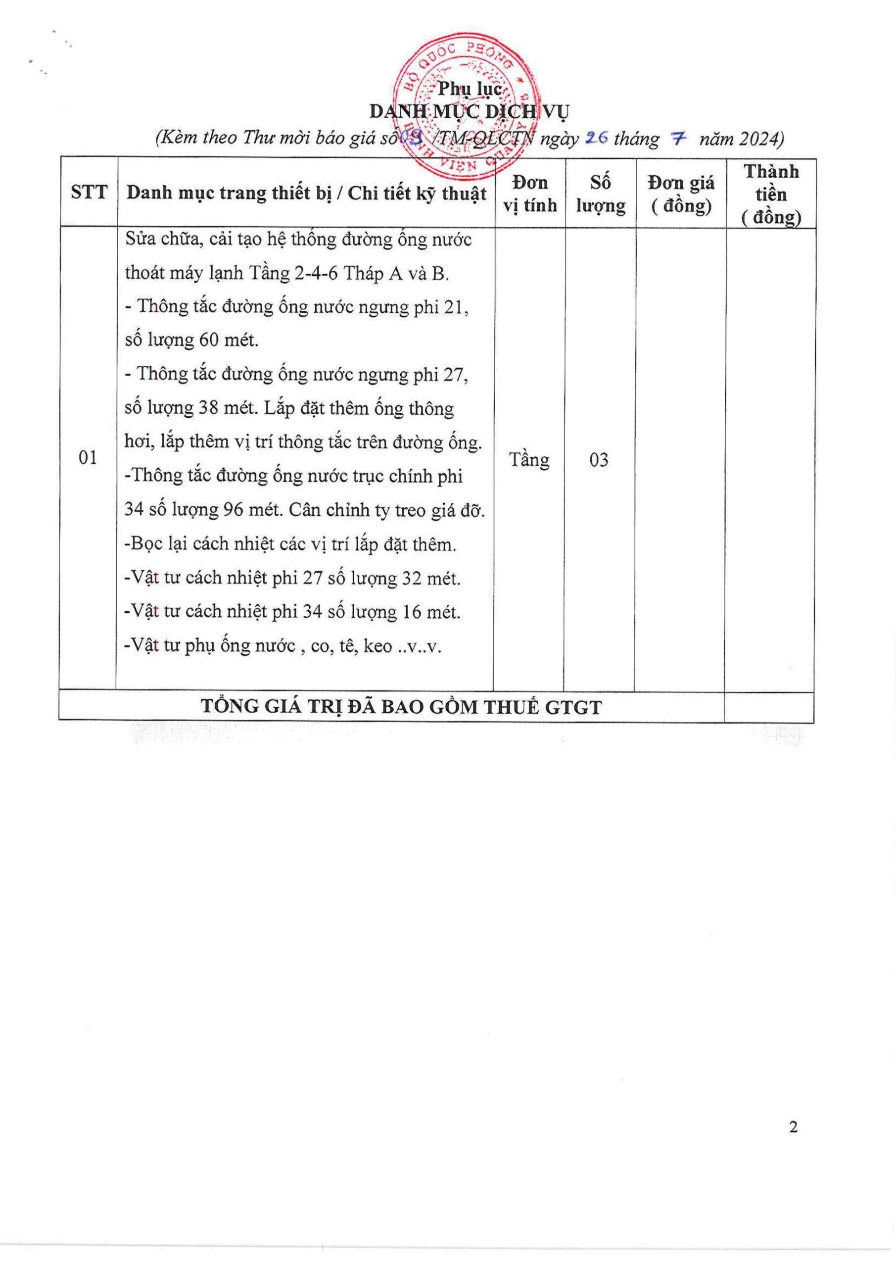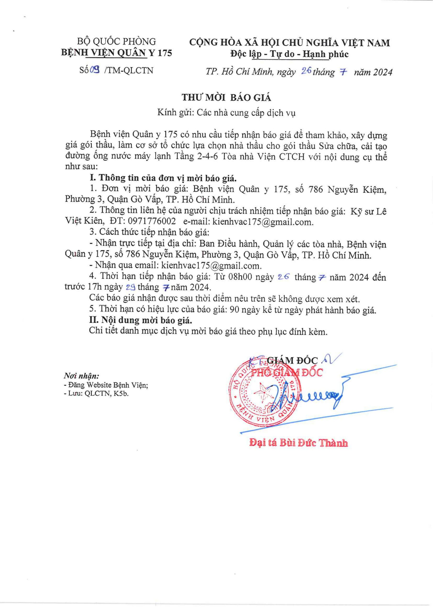 Bệnh viện Quân y 175 có nhu cầu tiếp nhận báo giá để tham khảo, xây dựng giá gói thầu, làm cơ sở tổ chức lựa chọn nhà thầu cho gói thầu sửa chữa, cải tạo đường ống nước máy lạnh tầng 2-4-6 Tòa nhà Viện CTCH.