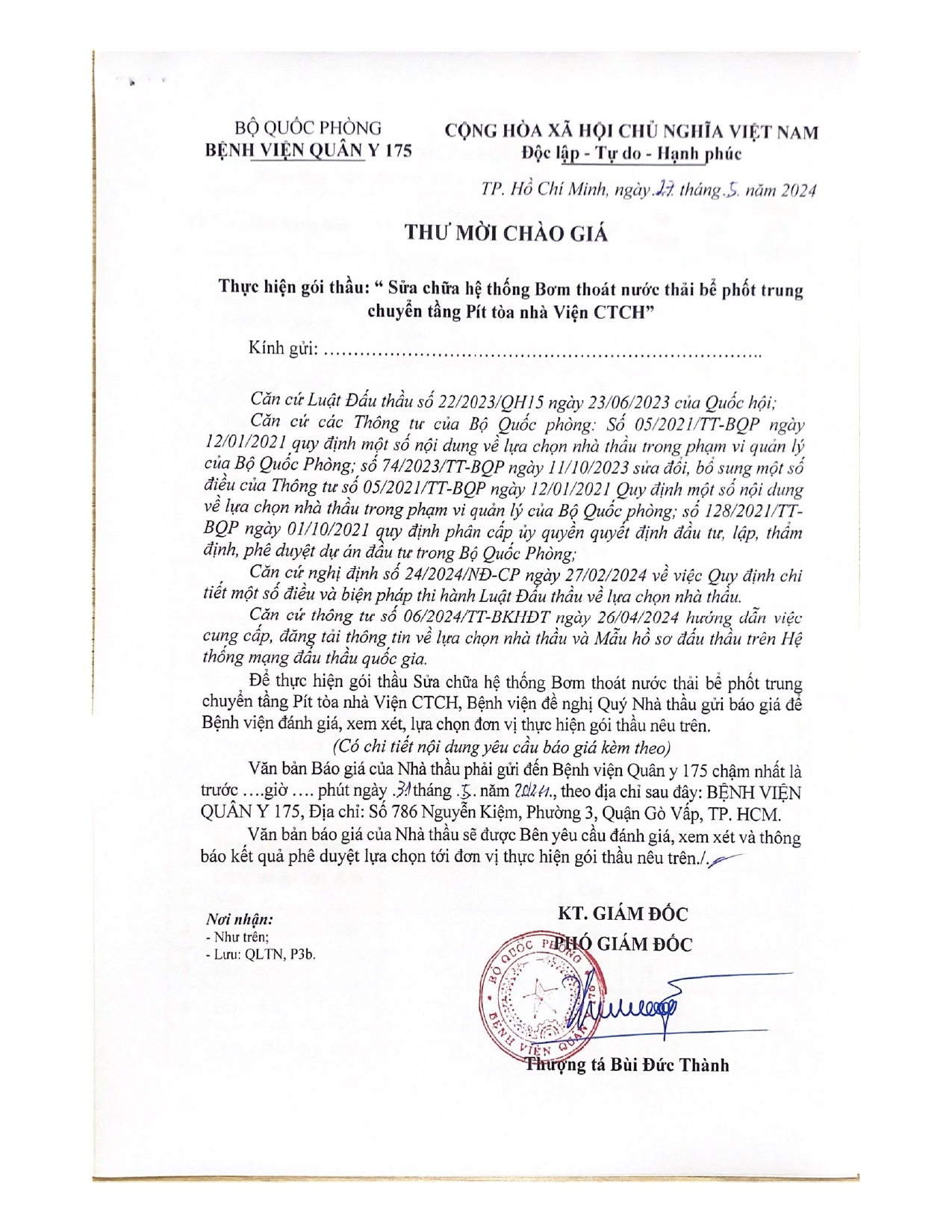 Bệnh viện Quân y 175 có nhu cầu tiếp nhận báo giá để tham khảo, xây dựng giá gói thầu, làm cơ sở tổ chức lựa chọn nhà thầu cho gói thầu sửa chữa hệ thống Bơm thoát nước thải bể phốt trung chuyển tầng Pít tòa nhà Viện CTCH
