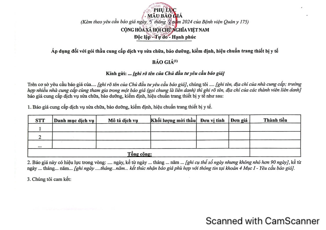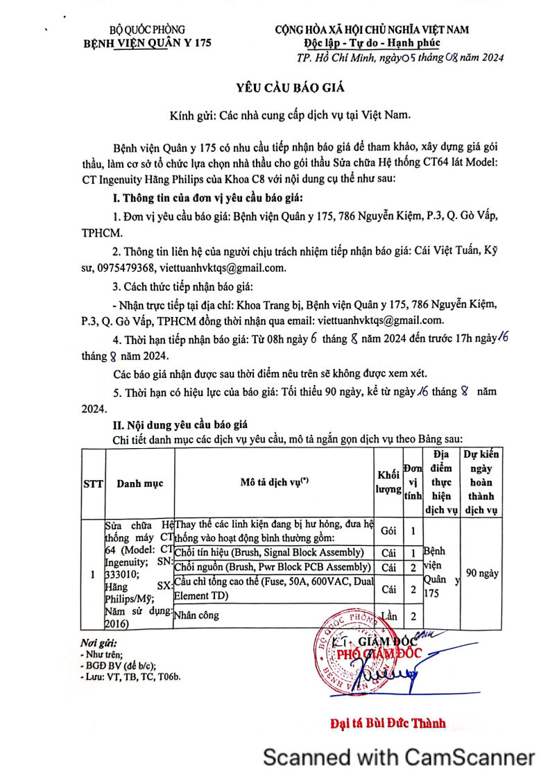 - Đơn vị yêu cầu báo giá: Bệnh viện Quân y 175, 786 Nguyễn Kiệm, P.3, Q. Gò Vấp, TPHCM.