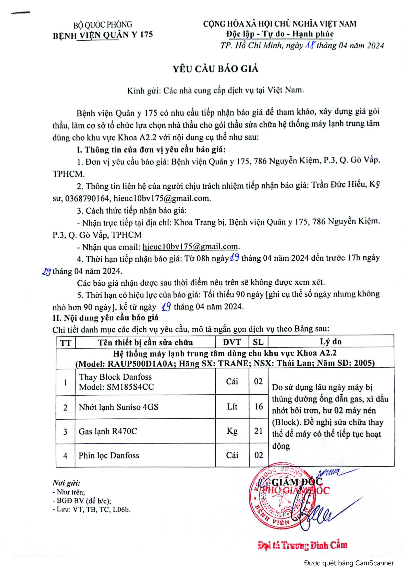 - Thông tin liên hệ của người chịu trách nhiệm tiếp nhận báo giá: Trần Đức Hiếu, Kỹ sư, 0368790164, hieuc10bv175@gmail.com.