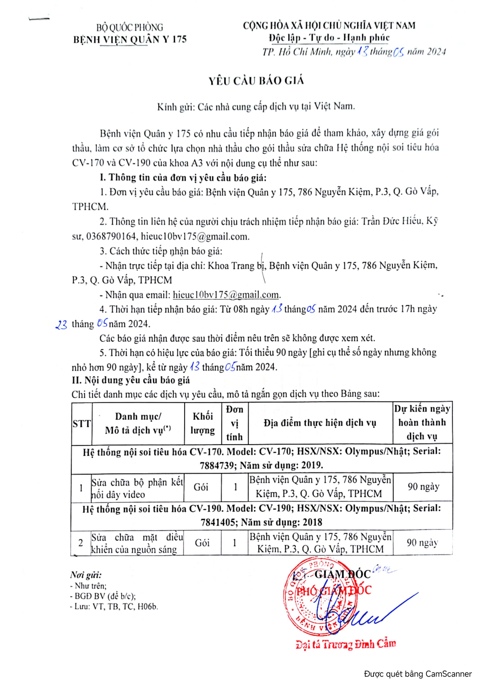 Bệnh viện Quân y 175 có nhu cầu tiếp nhận báo giá để tham khảo, xây dựng giá gói thầu, làm cơ sở tổ chức lựa chọn nhà thầu cho gói thầu sửa chữa Hệ thống nội soi tiêu hóa CV-170 và CV-190 của khoa A3 với nội dung cụ thể như sau: