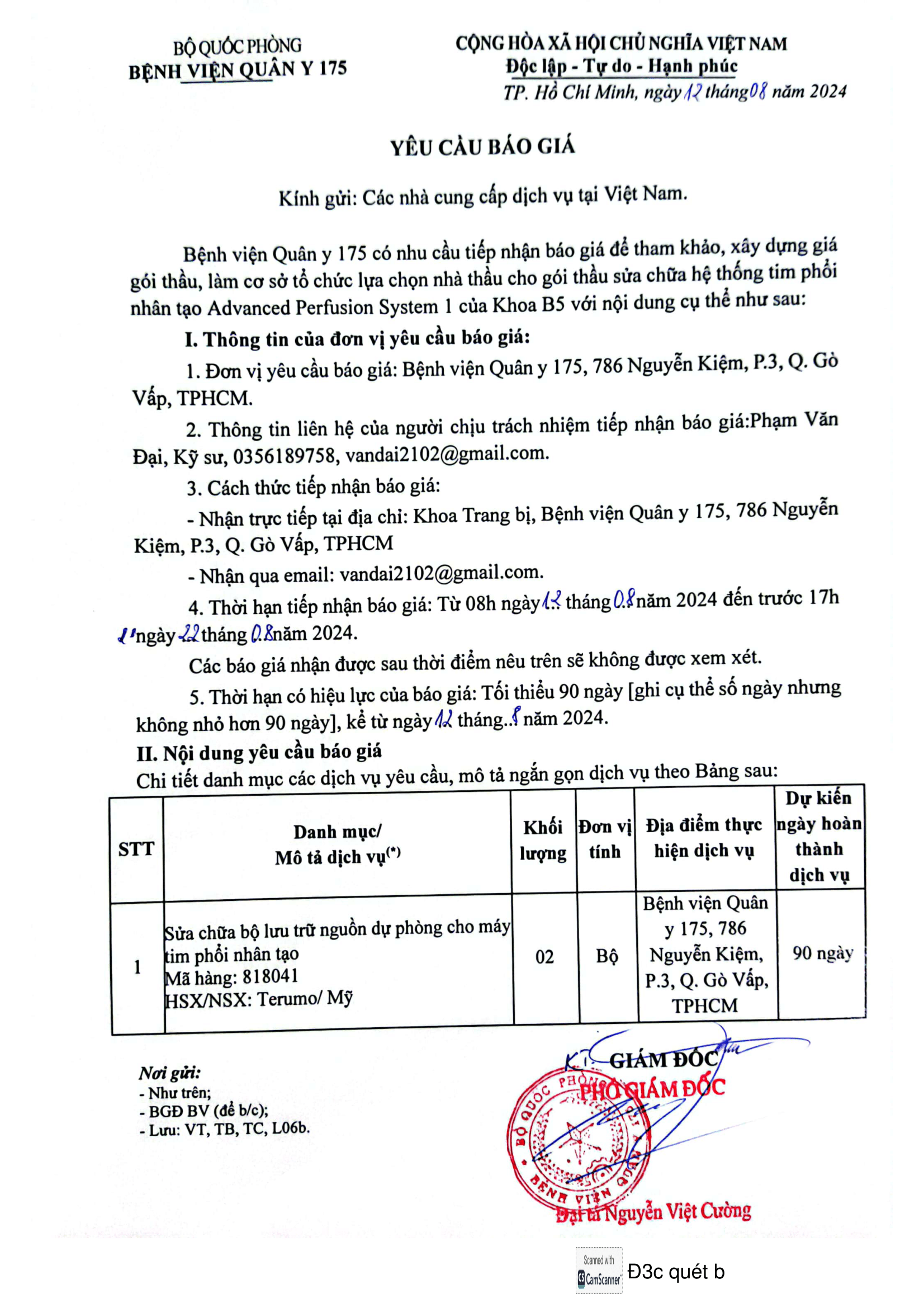 - Đơn vị yêu cầu báo giá: Bệnh viện Quân y 175, 786 Nguyễn Kiệm, P.3, Q. Gò Vấp, TPHCM.