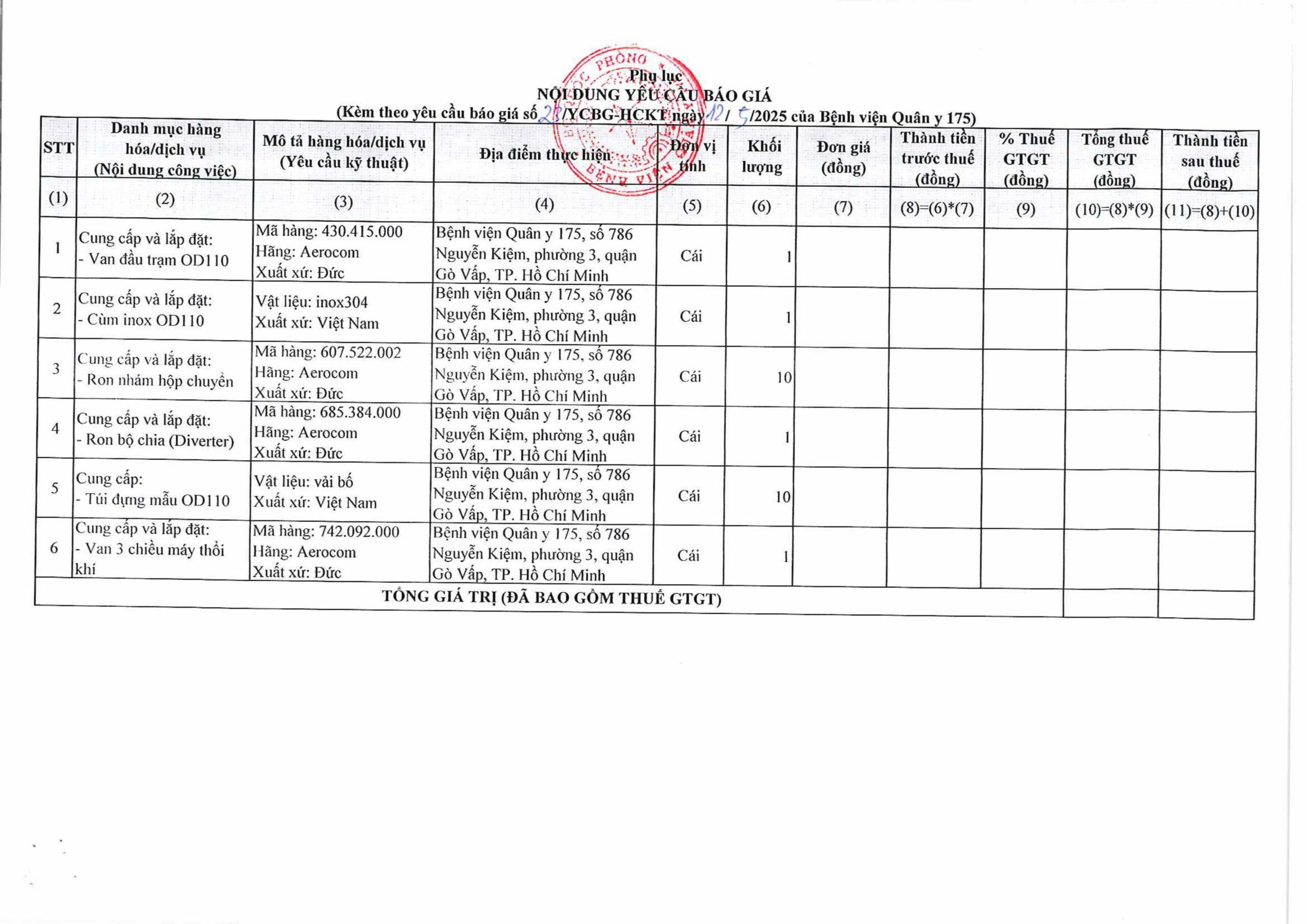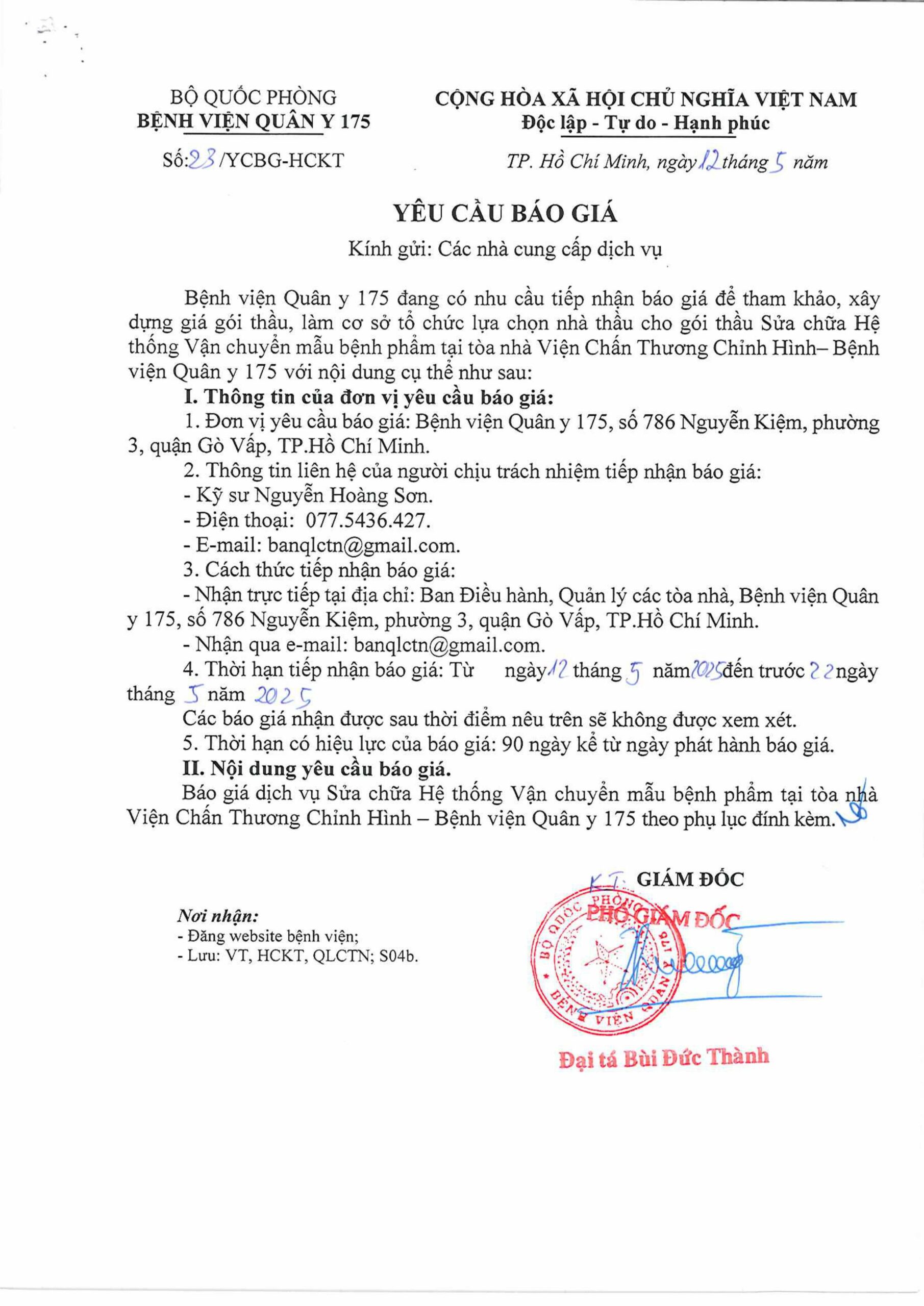 Yêu cầu báo giá cho gói thầu sửa chữa hệ thống vận chuyển mẫu bệnh phẩm tại Toà nhà VCTCH – BV175