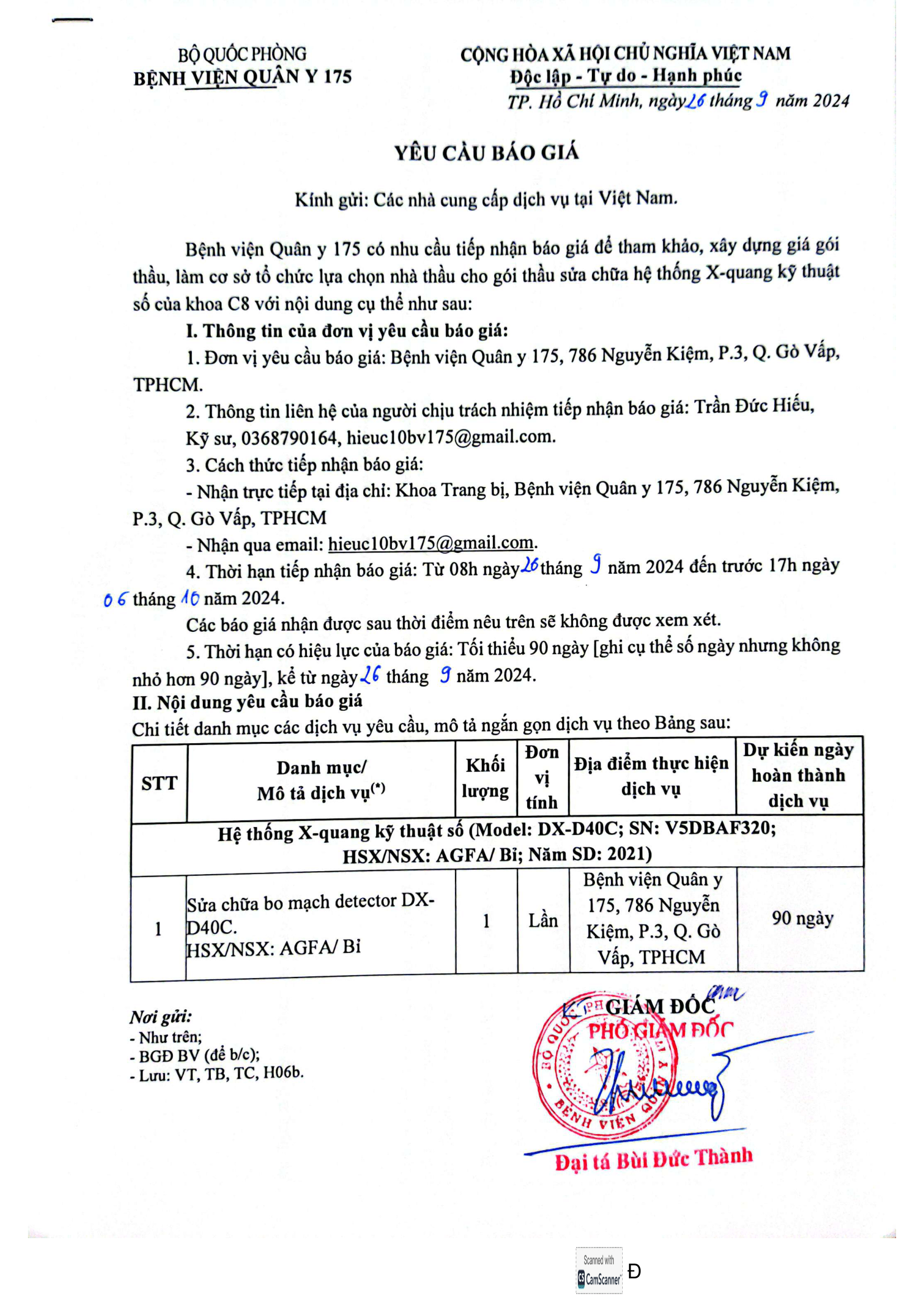 Bệnh viện Quân y 175 có nhu cầu tiếp nhận báo giá để tham khảo, xây dựng giá gói thầu, làm cơ sở tổ chức lựa chọn nhà thầu cho gói thầu sửa chữa hệ thống X-quang kỹ thuật số của khoa C8 với nội dung cụ thể như sau: