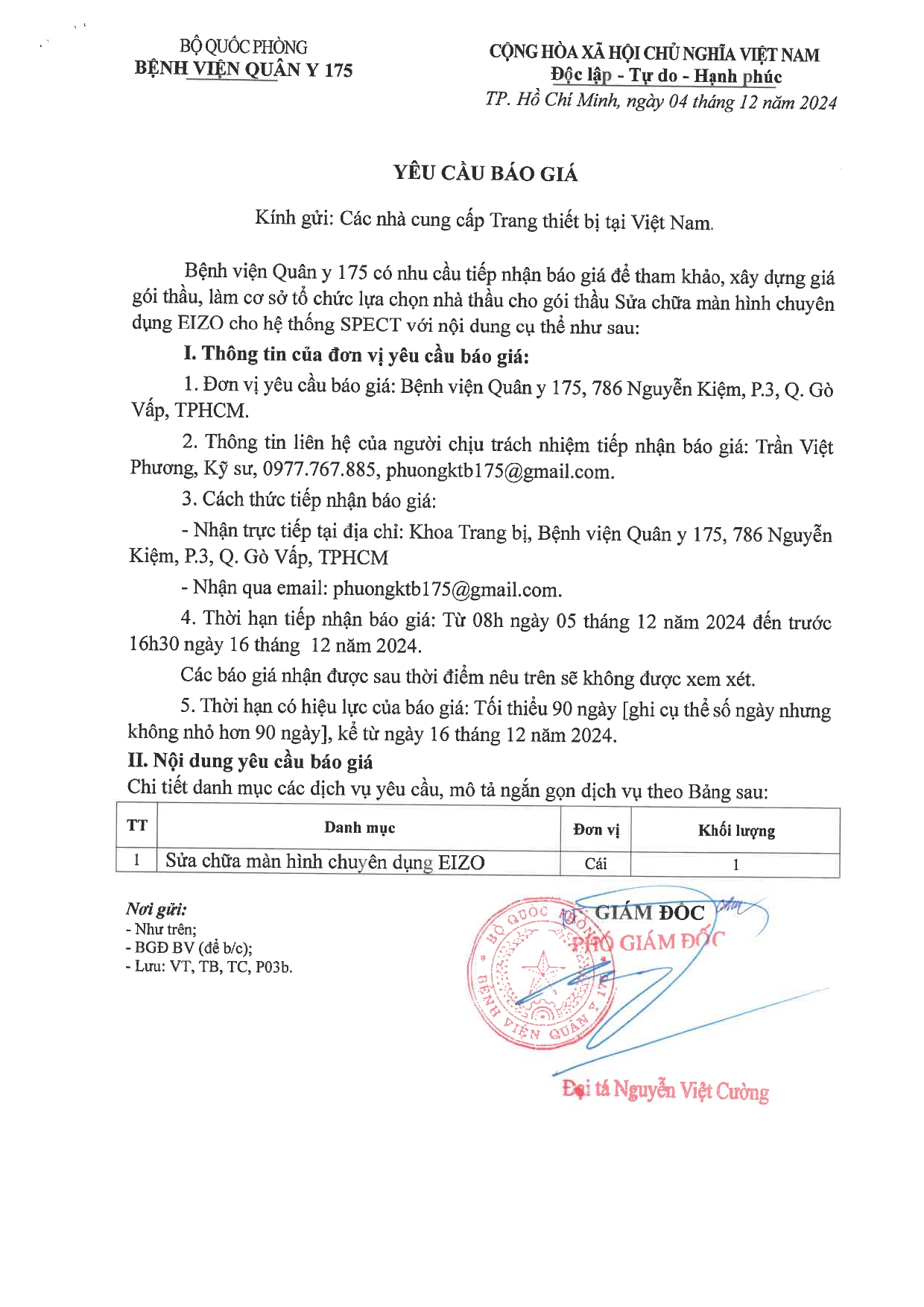 - Thông tin liên hệ của người chịu trách nhiệm tiếp nhận báo giá: Trần Việt Phương, Kỹ sư, 0977.767.885, phuongktb175@gmail.com.
