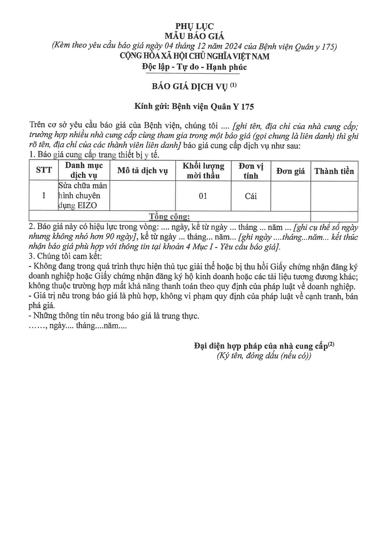 - Đơn vị yêu cầu báo giá: Bệnh viện Quân y 175, 786 Nguyễn Kiệm, P.3, Q. Gò Vấp, TPHCM.