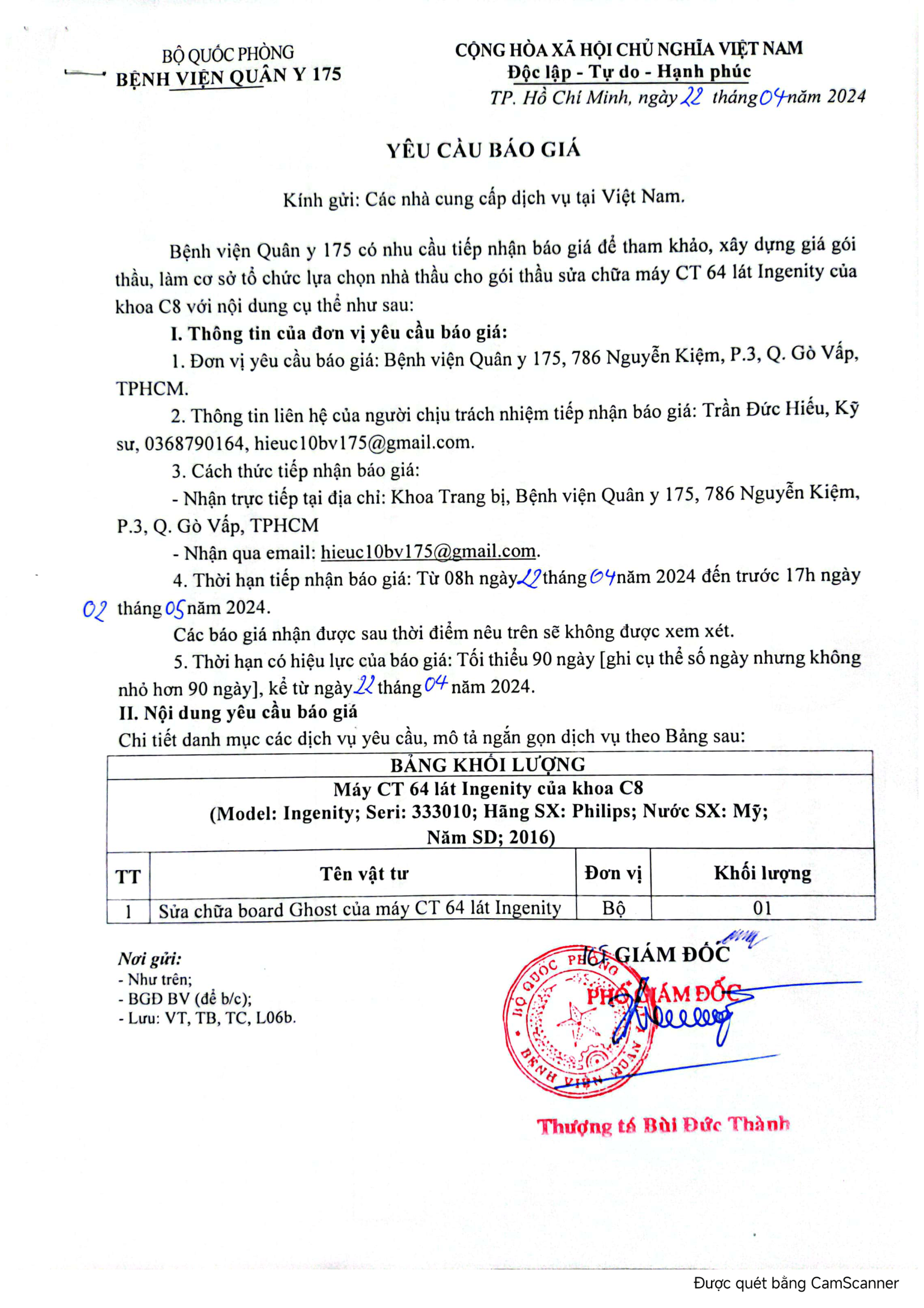 Bệnh viện Quân y 175 có nhu cầu tiếp nhận báo giá để tham khảo, xây dựng giá gói thầu, làm cơ sở tổ chức lựa chọn nhà thầu cho gói thầu sửa chữa máy CT 64 lát Ingenity của khoa C8.