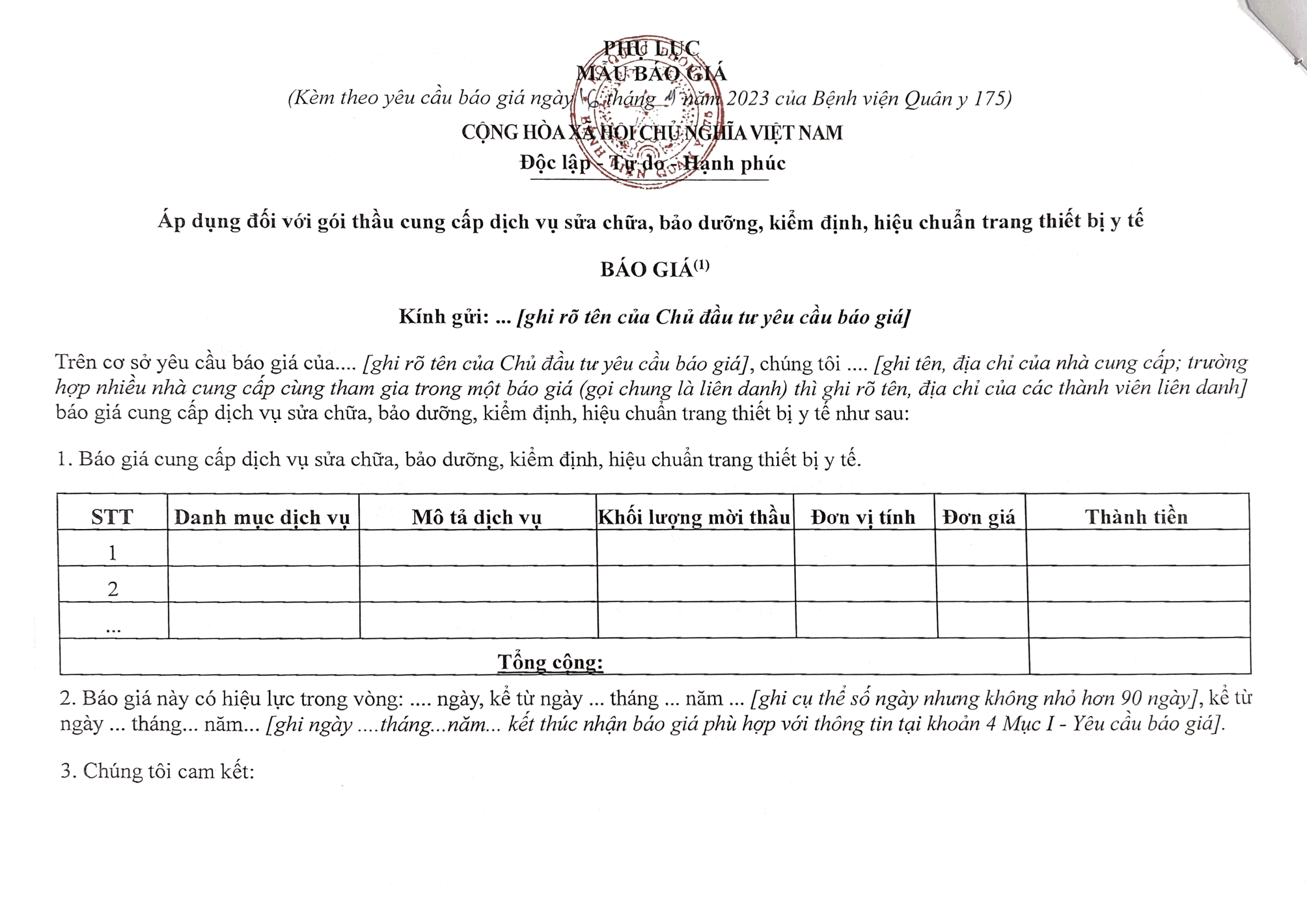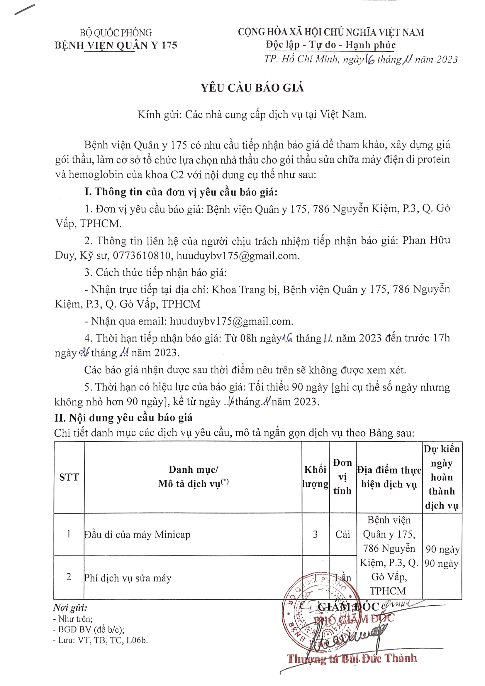 - Đơn vị yêu cầu báo giá: Bệnh viện Quân y 175, 786 Nguyễn Kiệm, P.3, Q. Gò Vấp, TPHCM.