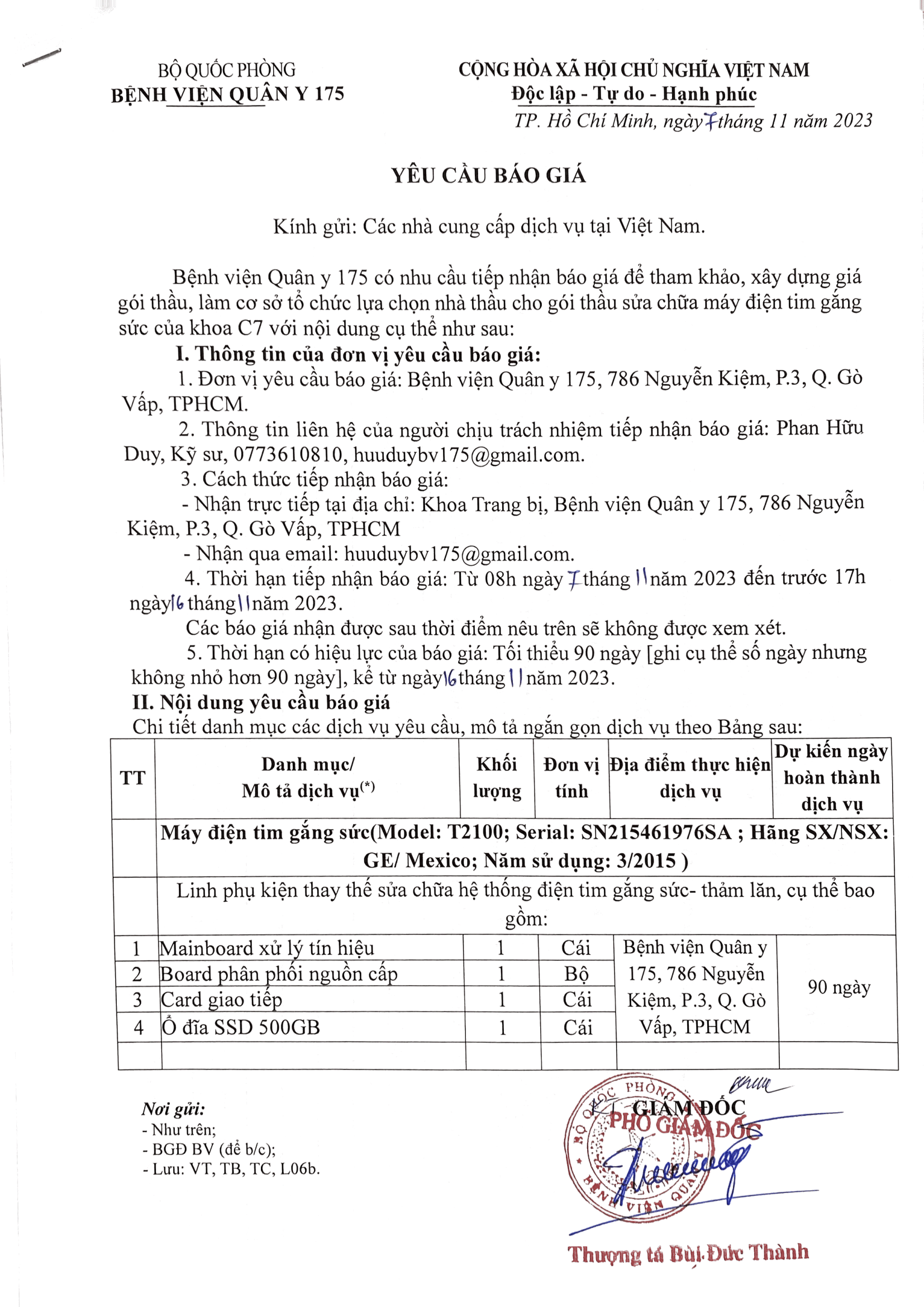 | 1 | Mainboard xử lý tín hiệu | 1 | Cái | Bệnh viện Quân y 175, 786 Nguyễn Kiệm, P.3, Q. Gò Vấp, TPHCM | 90 ngày |